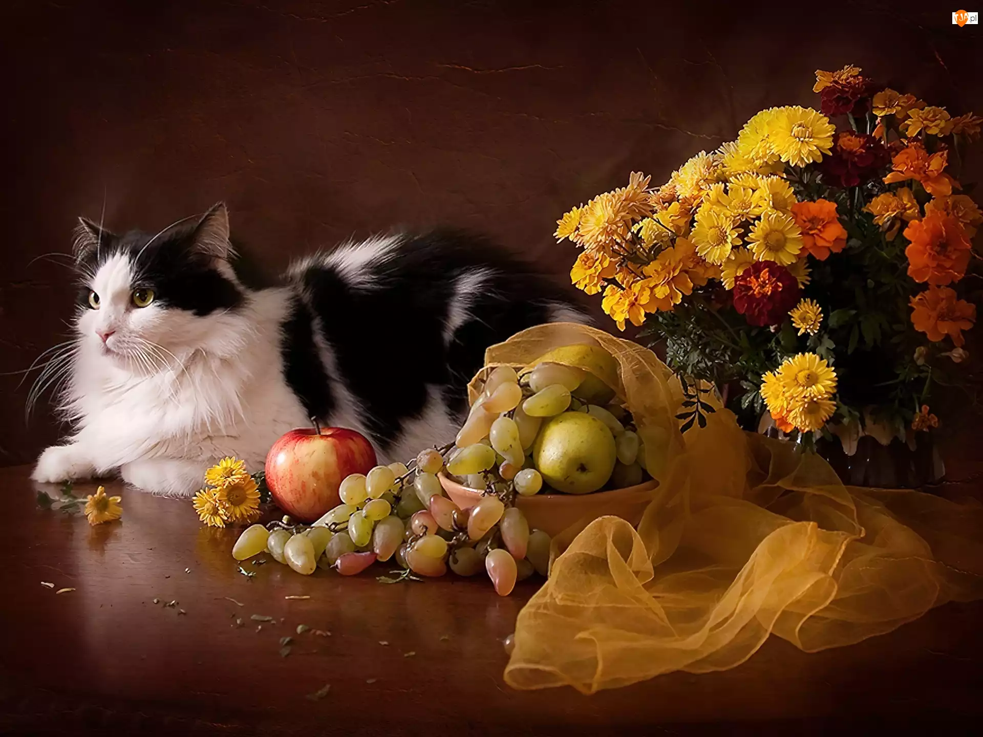 Tkanina, Kot, Kwiatów, Bukiet, Owoce