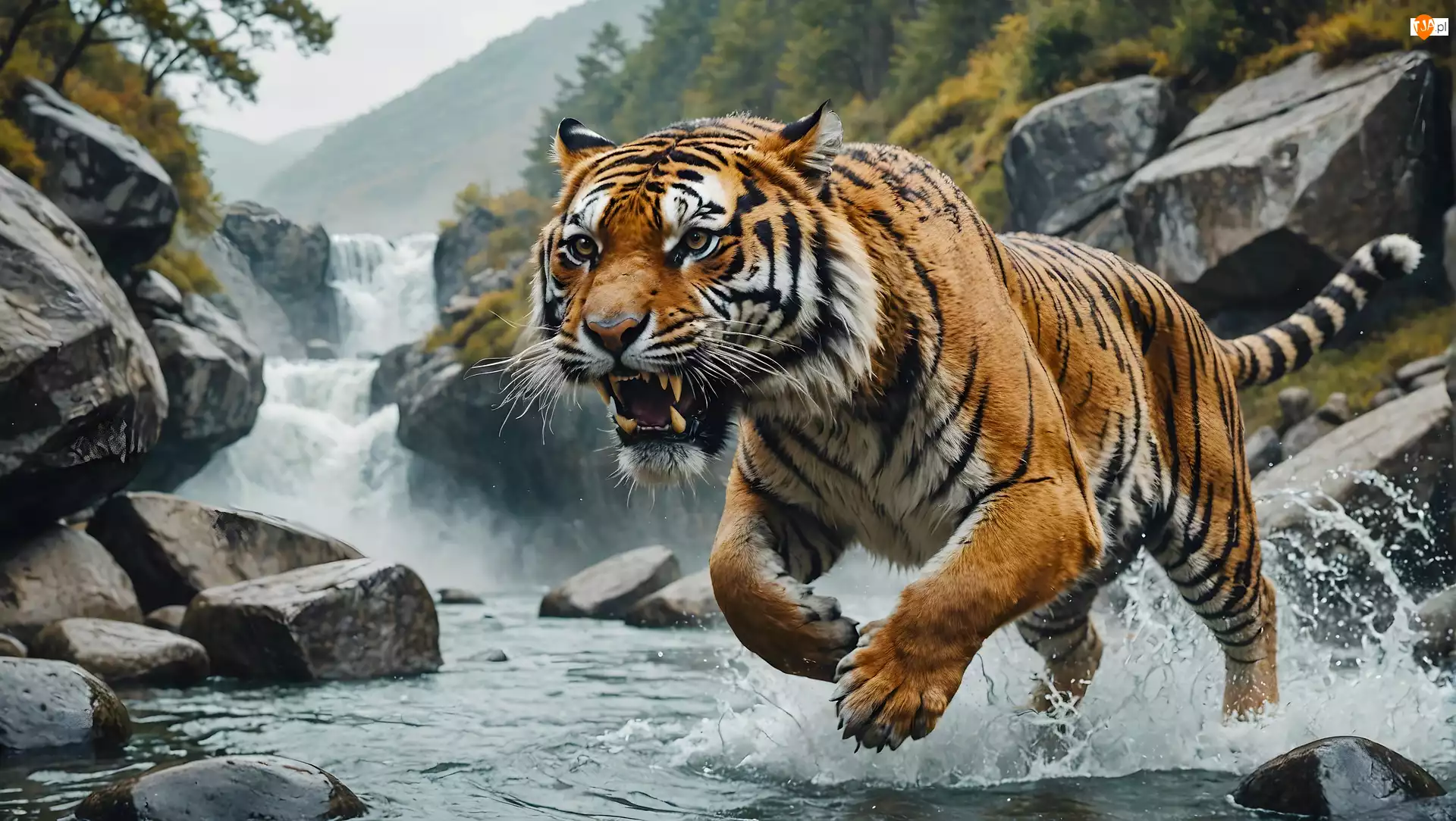 Skok, Pręgi, Woda, Przyroda, Tygrys, Natura, Kamienie, Drapieżne, Ogon, Akcja, Dzikie, Paszcza, Rzeka, Sierść, Kły, Zwierzę