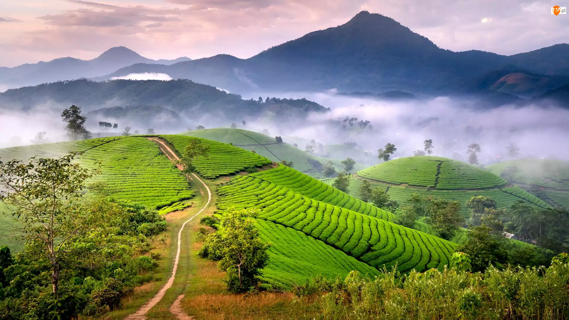 Wietnam, Mgła, Ścieżka, Góry, Wzgórza, Zielone, Plantacja herbaty, Pola, Long Coc Tea Hill, Drzewa