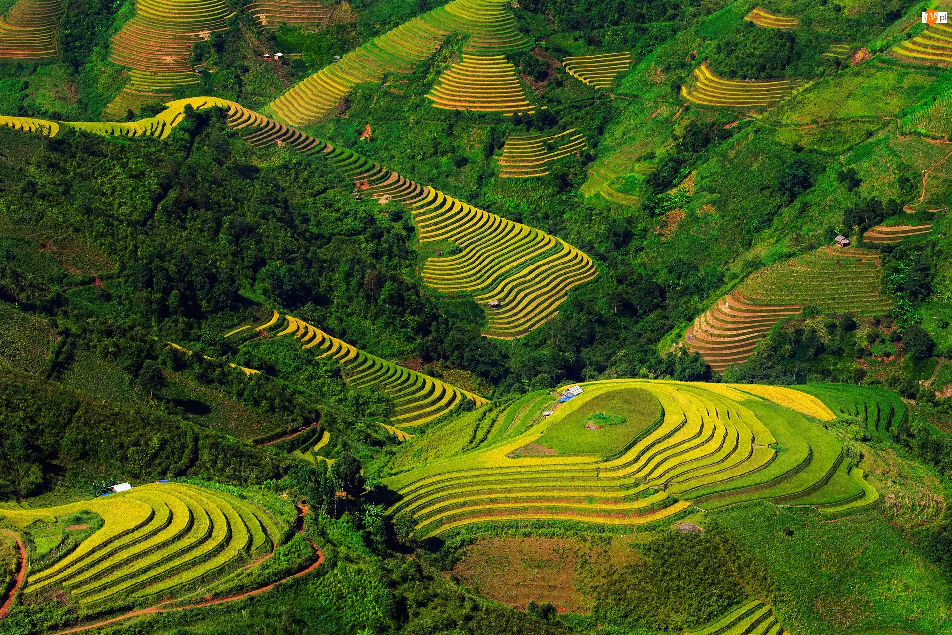 Góry, Wietnam, Tarasy ryżowe, Pola, Wzgórza