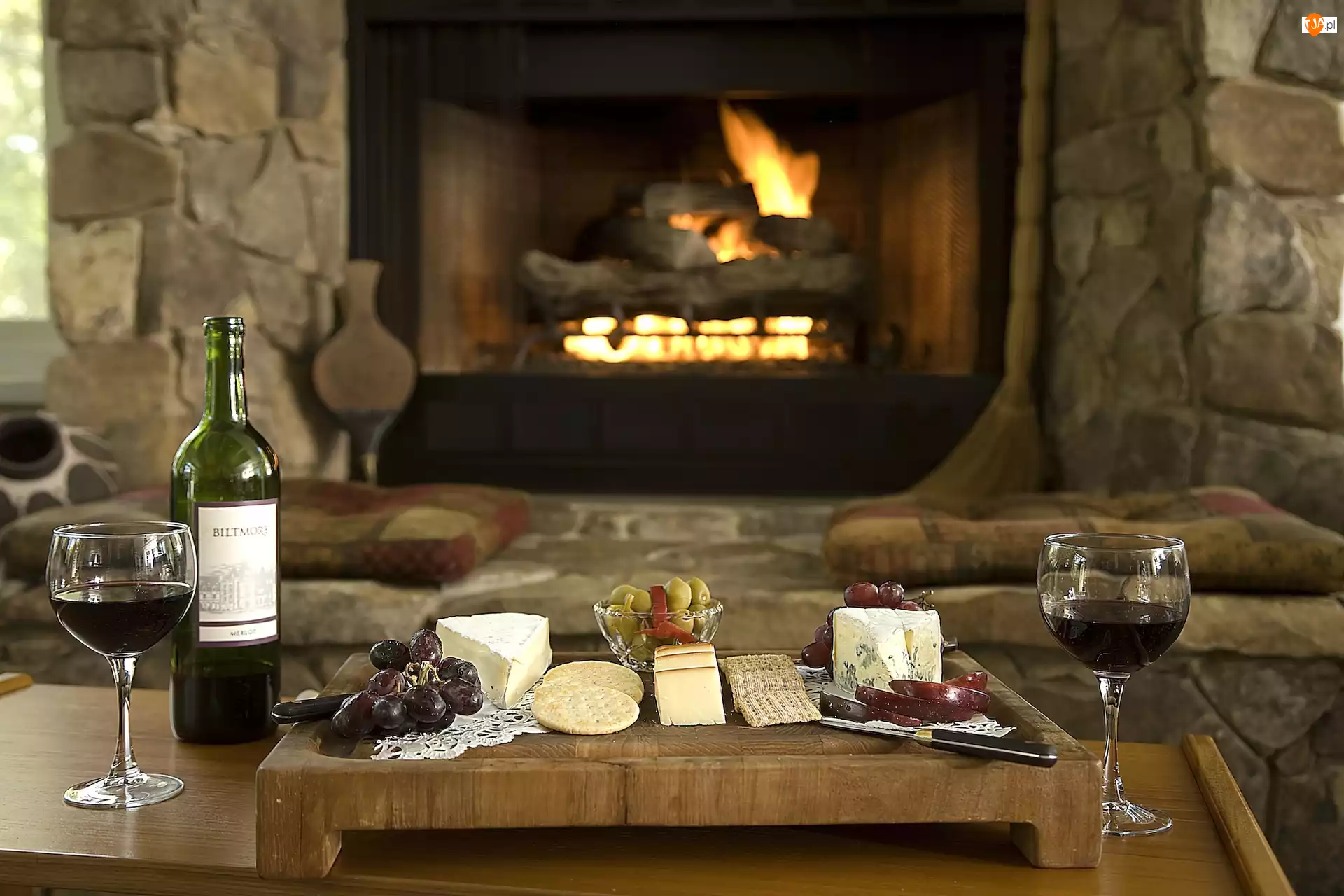 Winogrona, Sery, Romantyczna, Kominek, Wino, Kolacja