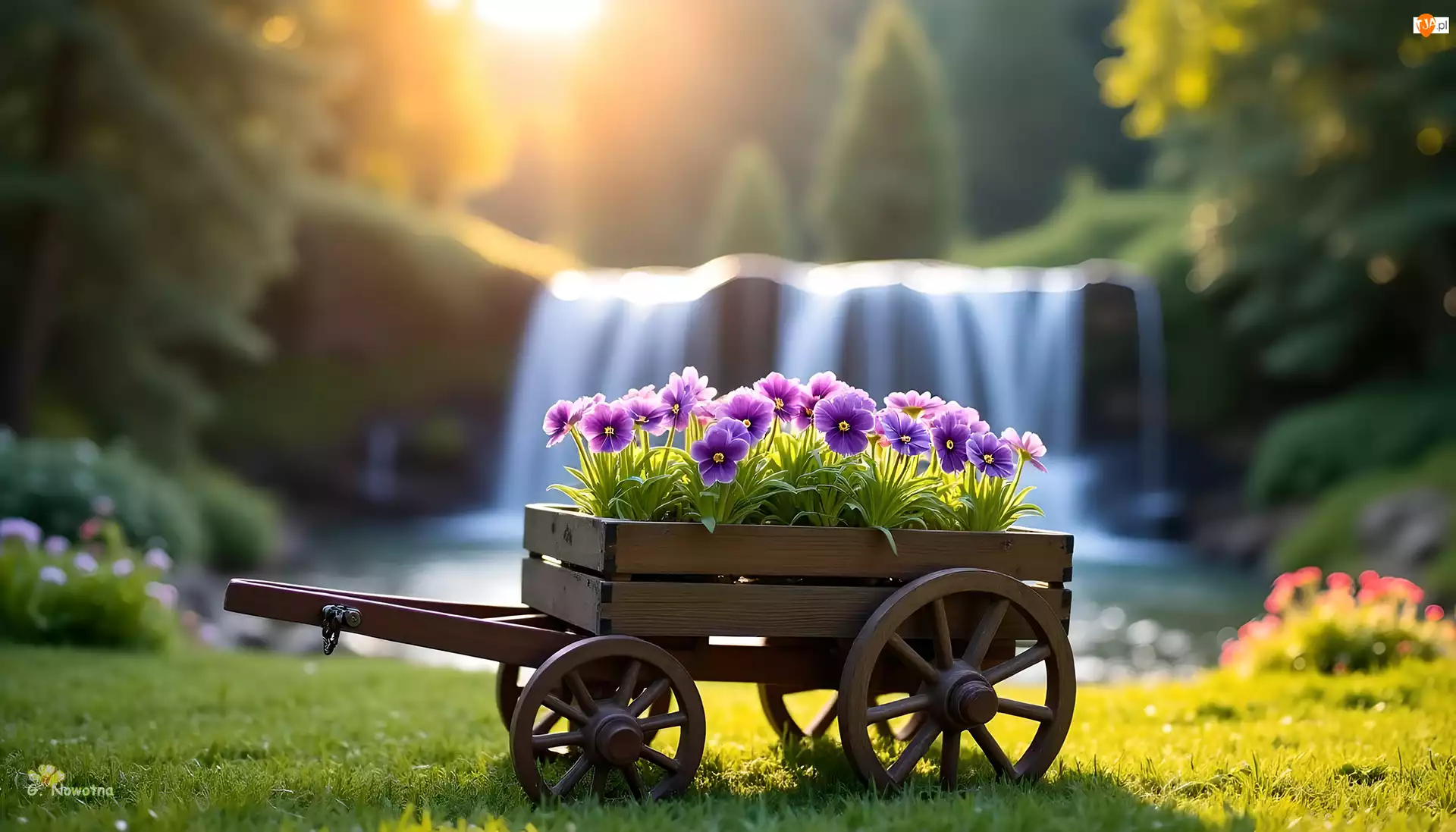 Wózek, Drewniany, Kwiaty, Grafika, Fioletowe, Wodospad