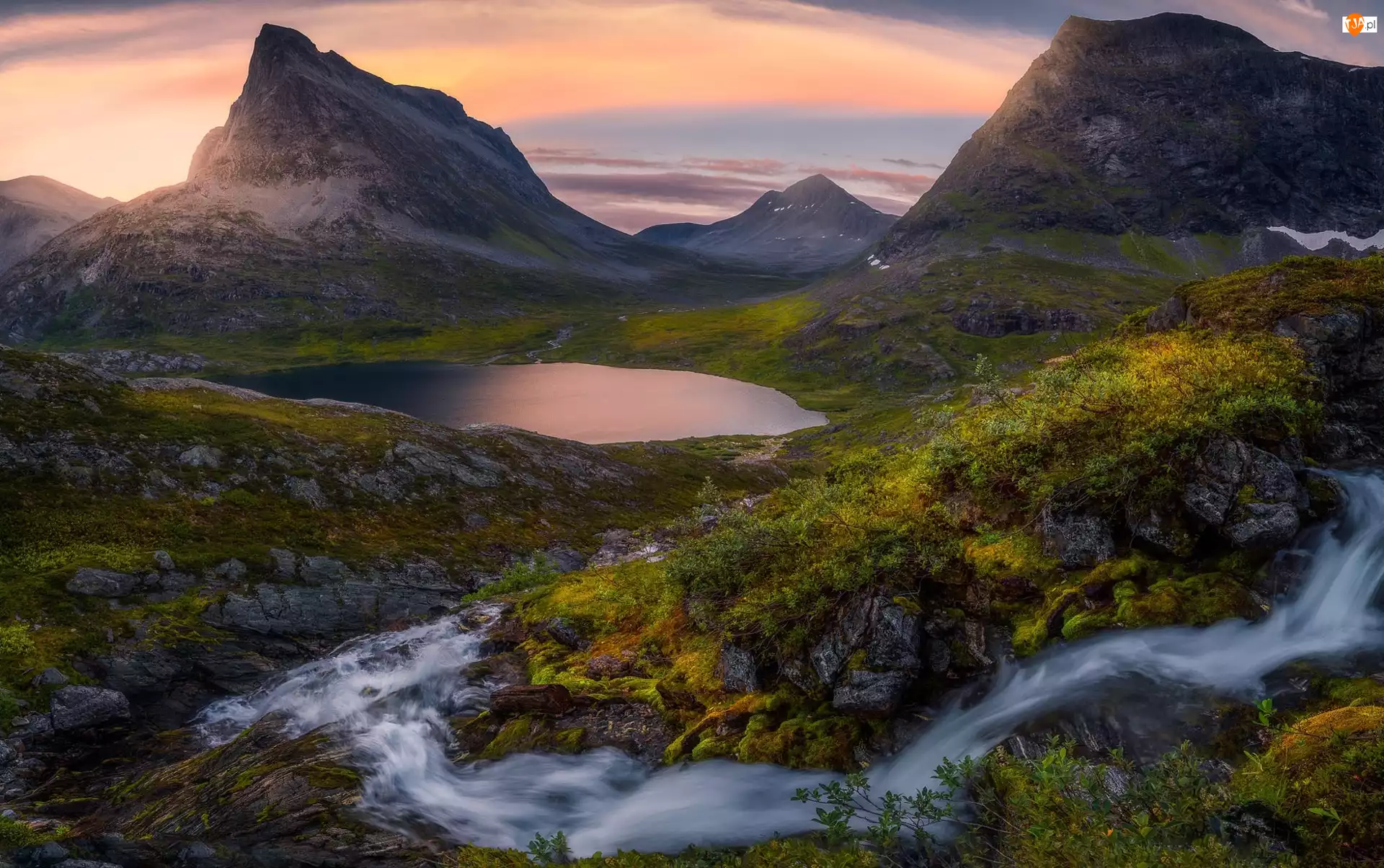 Norwegia, Dolina Romsdalen, Jezioro, Roślinność, Góry, Wodospad