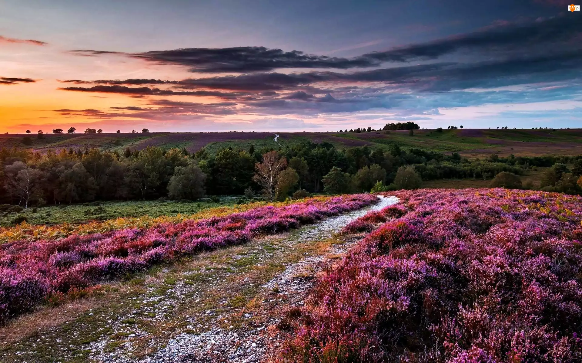 Zachód, Wrzosowisko, Pola, Lato, Słońca, Drzewa, Chmury