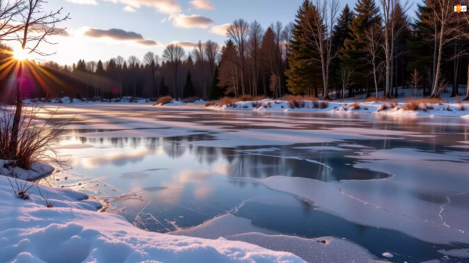 Zamarznięte, Zima, Śnieg, Drzewa, Jezioro, Promienie słońca