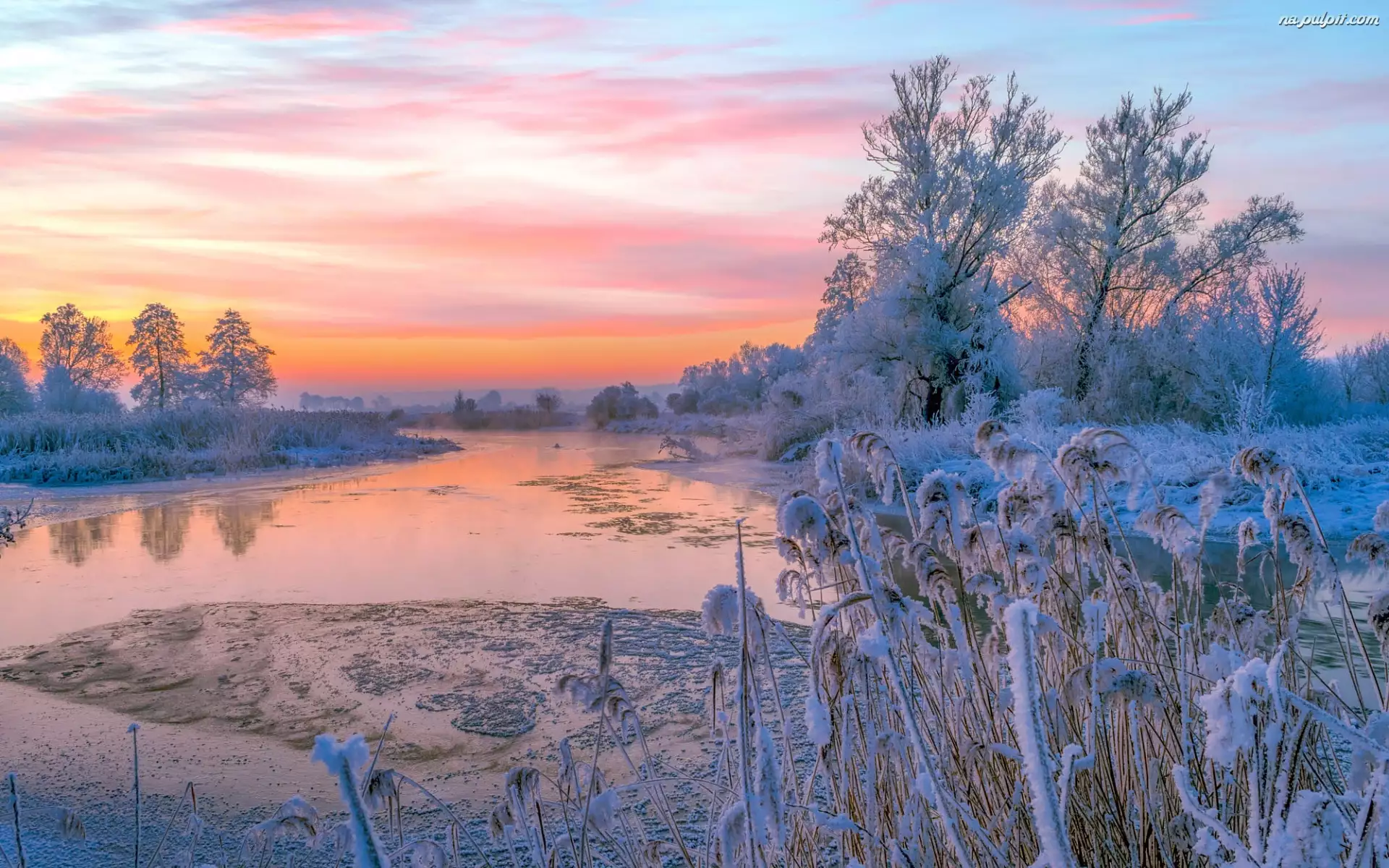 Zamglenie, Śnieg, Trzcina, Brzeg, Ranek, Drzewa, Rzeka, Zima, Świt