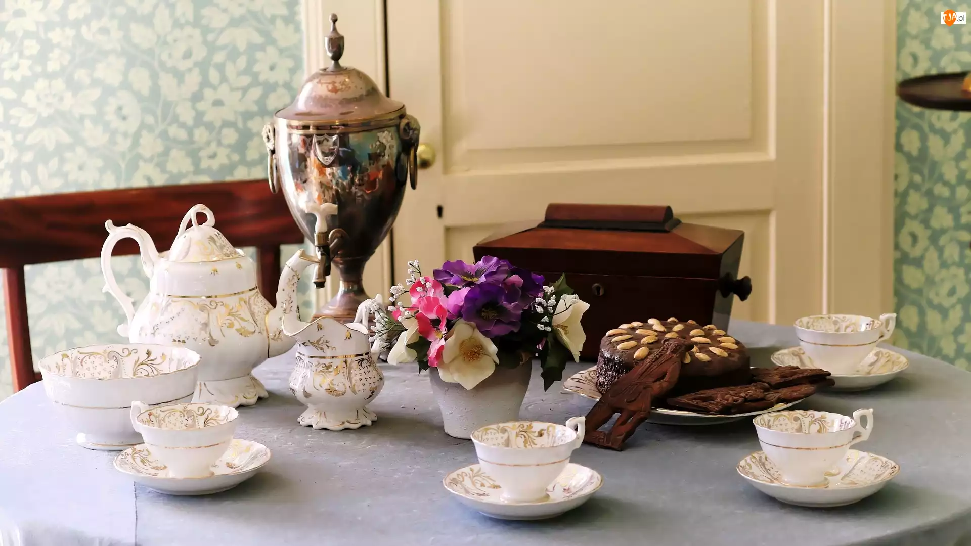 Kwiaty, Zastawa, Wazon, Ciasto, Samowar, Porcelana, Filiżanki, Stół, Dzbanek