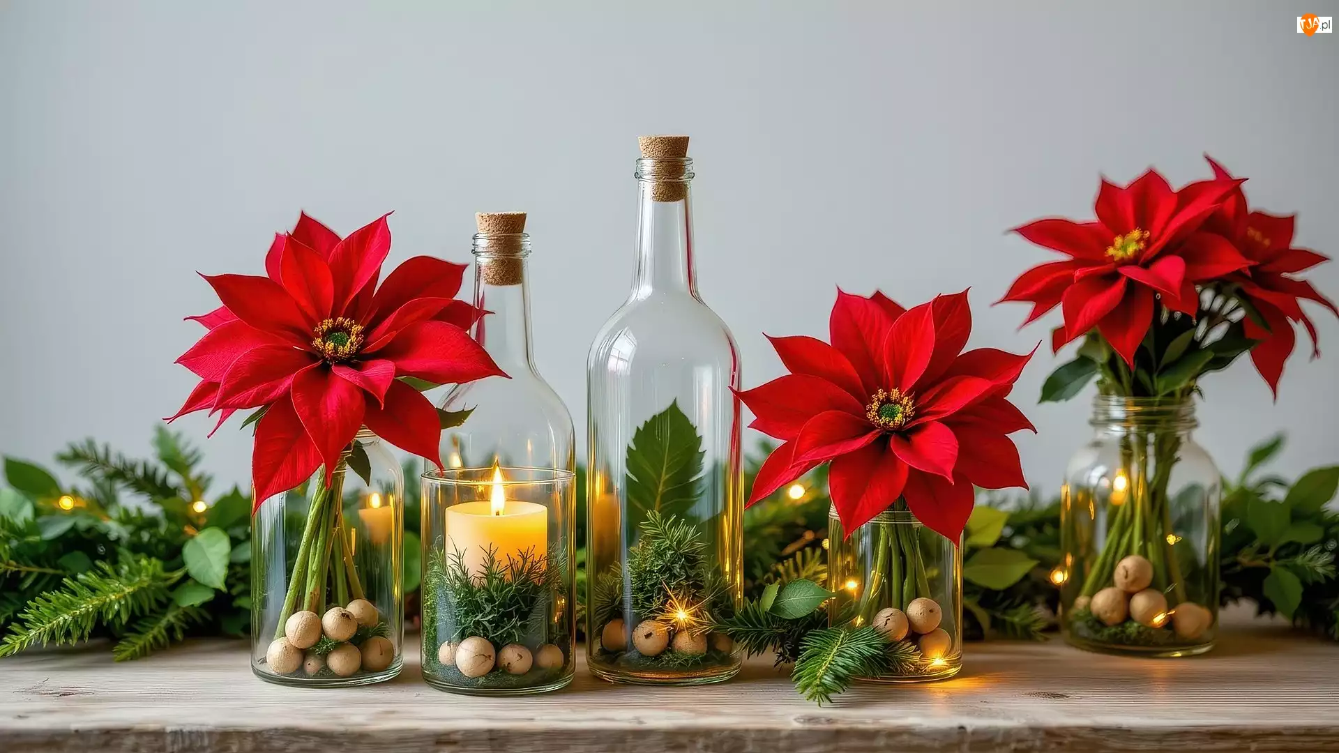 Zielone, Kwiaty, Słoiki, Rośliny, Gwiazda betlejemska, Świeca, Kompozycja, Butelki