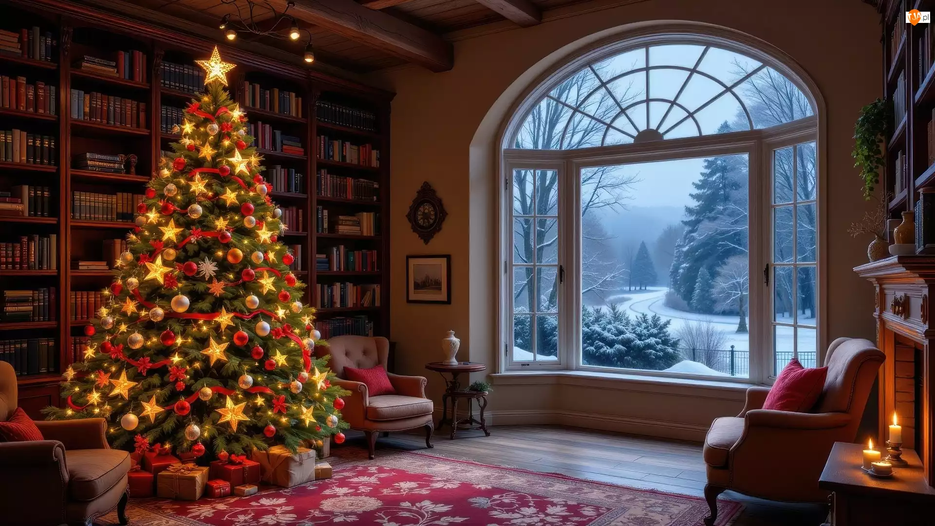Zima, Salon, Okno, Fotele, Prezenty, Udekorowana, Choinka, Boże Narodzenie, Książki