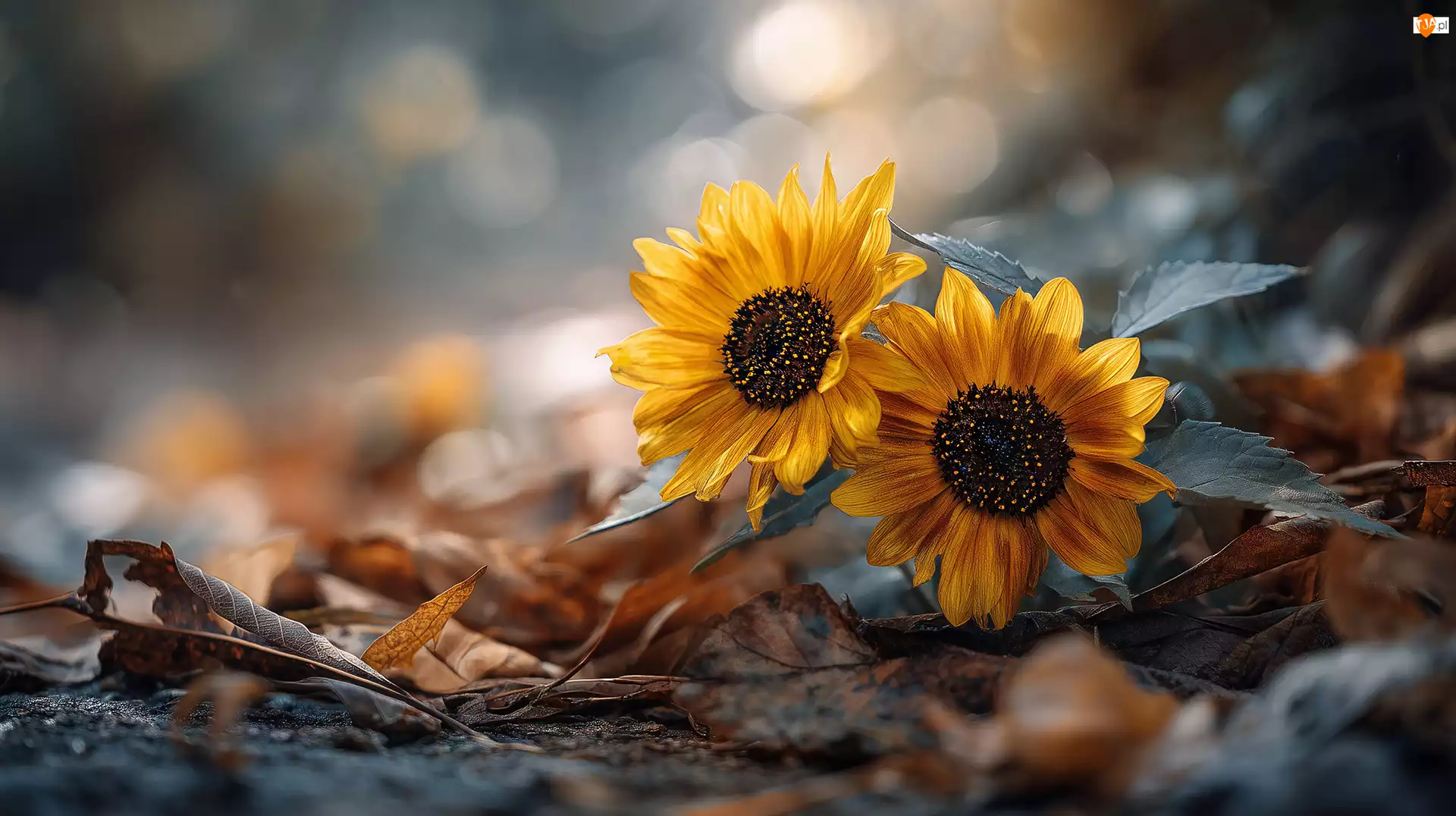 Żółte, Słoneczniki ozdobne, Suche, Grafika AI, Kwiaty, Liście