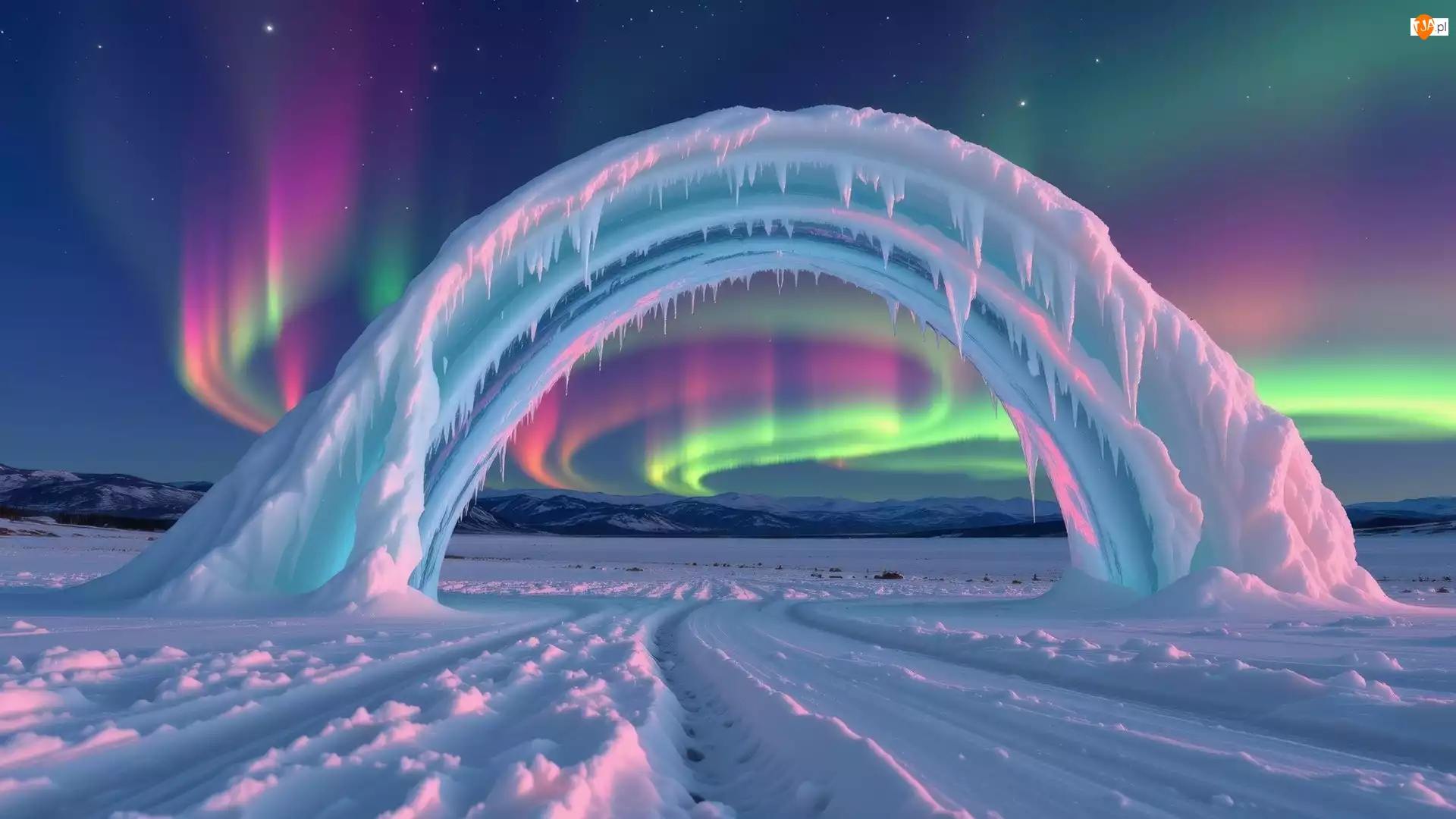 Zorza polarna, Zima, Łuk, Śnieg, Oblodzony, Sople, AI, Ośnieżony