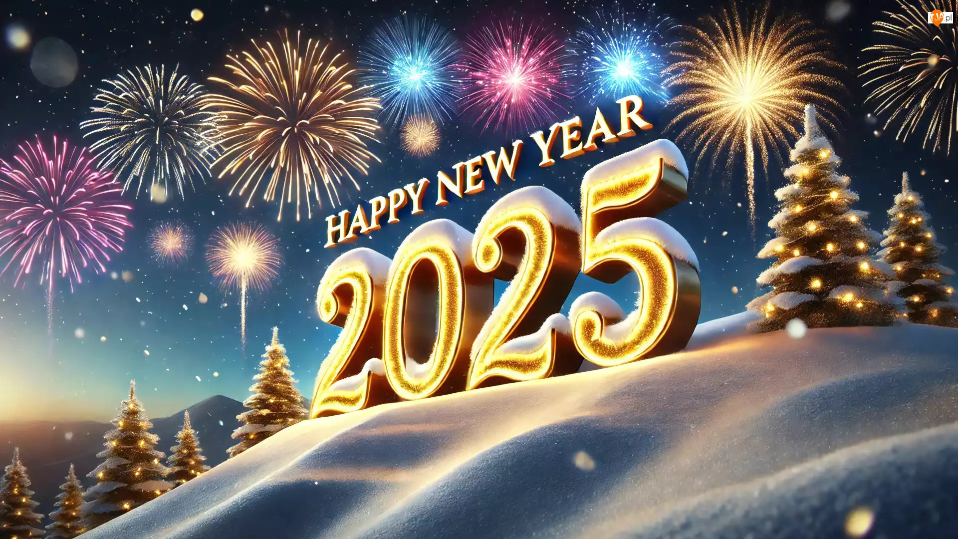 2025, Napis, Śnieg, Nowy Rok, Wzgórze, Choinki, Fajerwerki