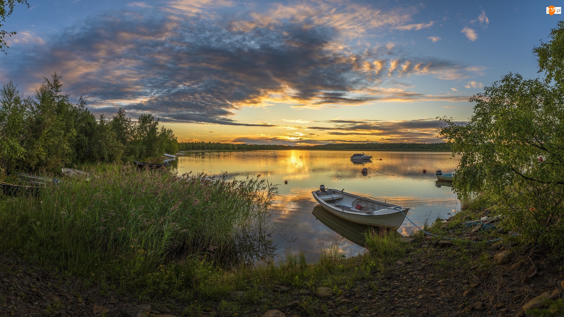Trawa, Lato, Łódki, Hailuoto, Zachód słońca, Drzewa, Finlandia, Jezioro