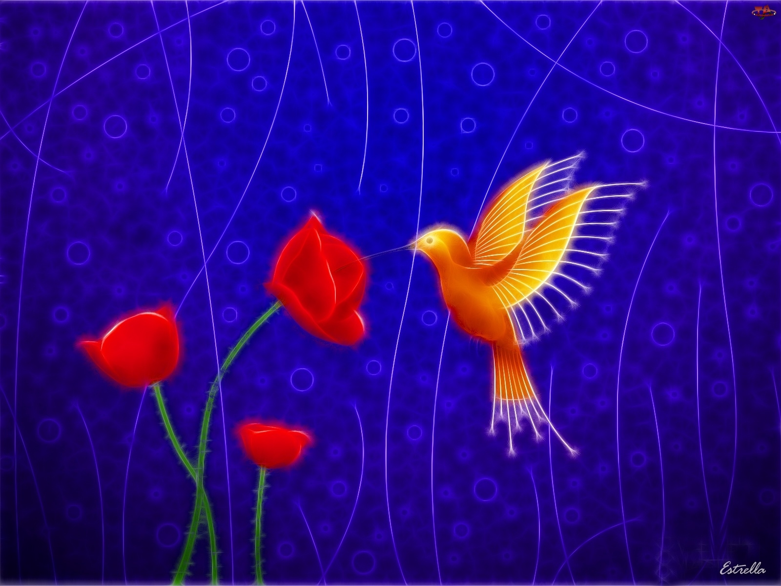 3D, Ptak, Granatowe, Kwiaty, Tło