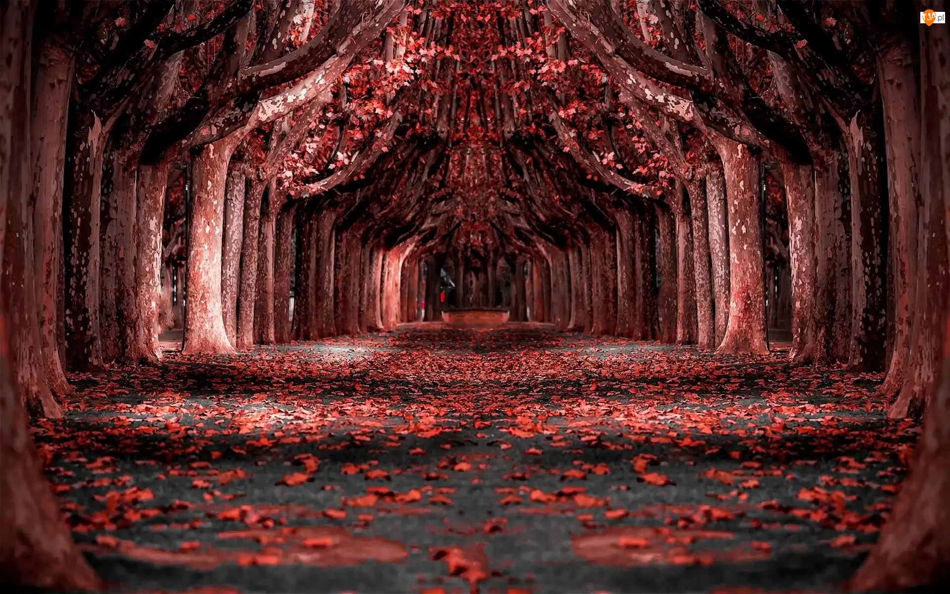 Aleja, Drzewa, Czerwień, Szpaler, Liście