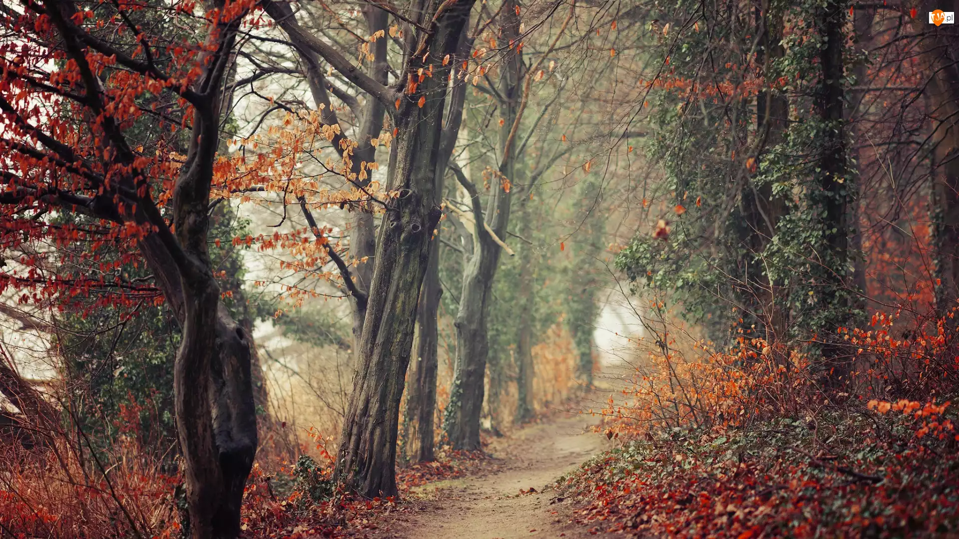 Drzewa, Ścieżka, Las, Jesień, Krzewy