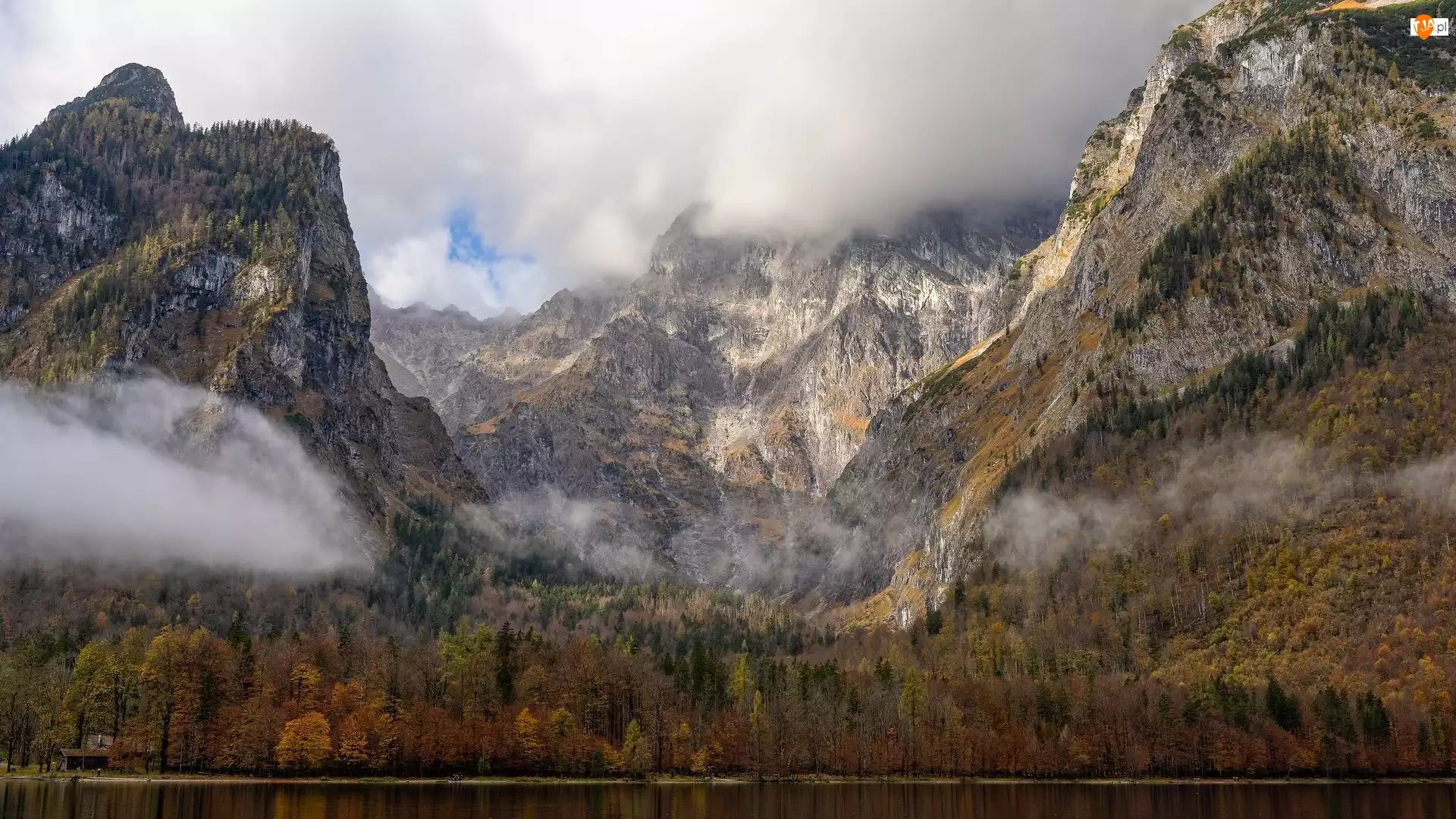Alpy, Góry, Drzewa, Niemcy, Mgła, Jezioro Konigssee