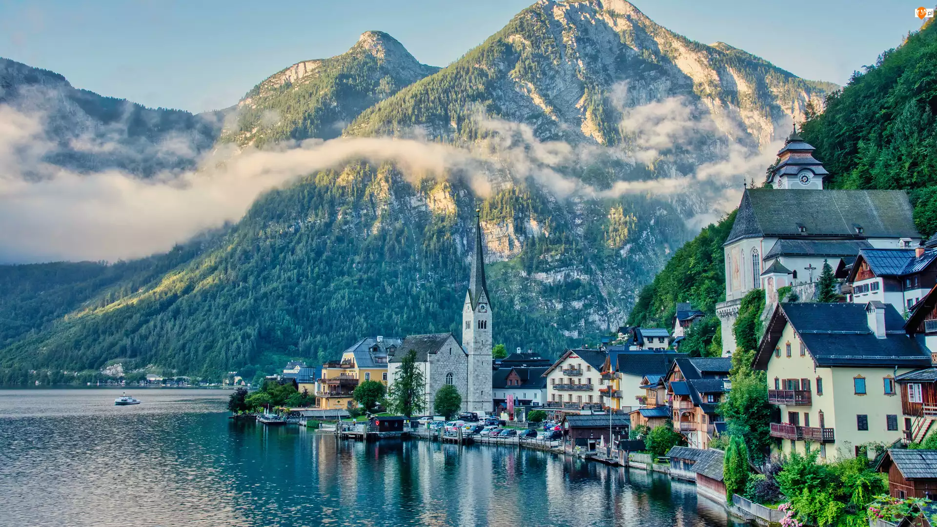 Mgła, Austria, Góry, Domy, Hallstatt, Alpy Salzburskie, Kościół, Jezioro Hallstattersee