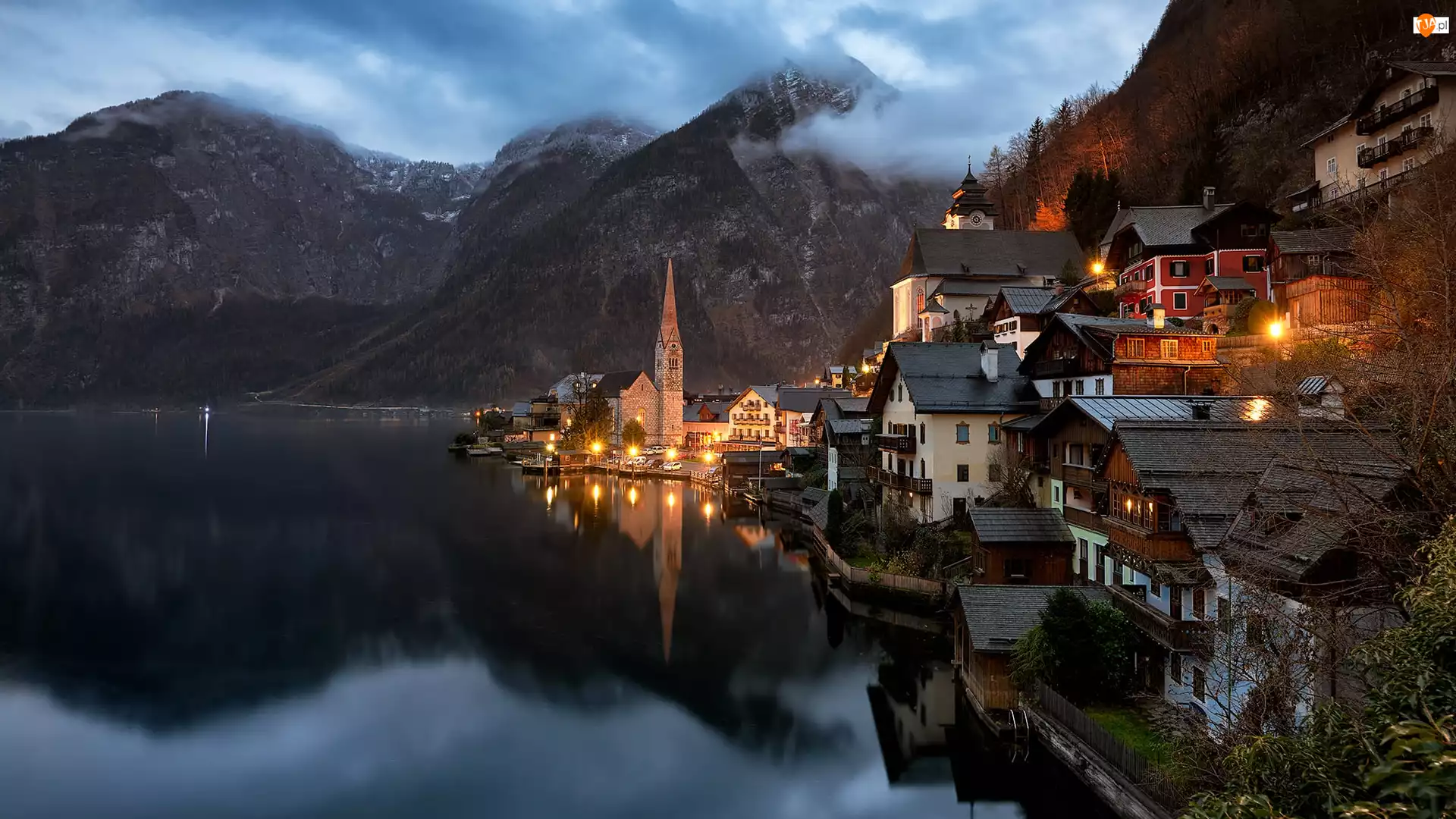 Alpy Salzburskie, Jezioro Hallstattersee, Austria, Góry, Hallstatt, Kościół, Domy
