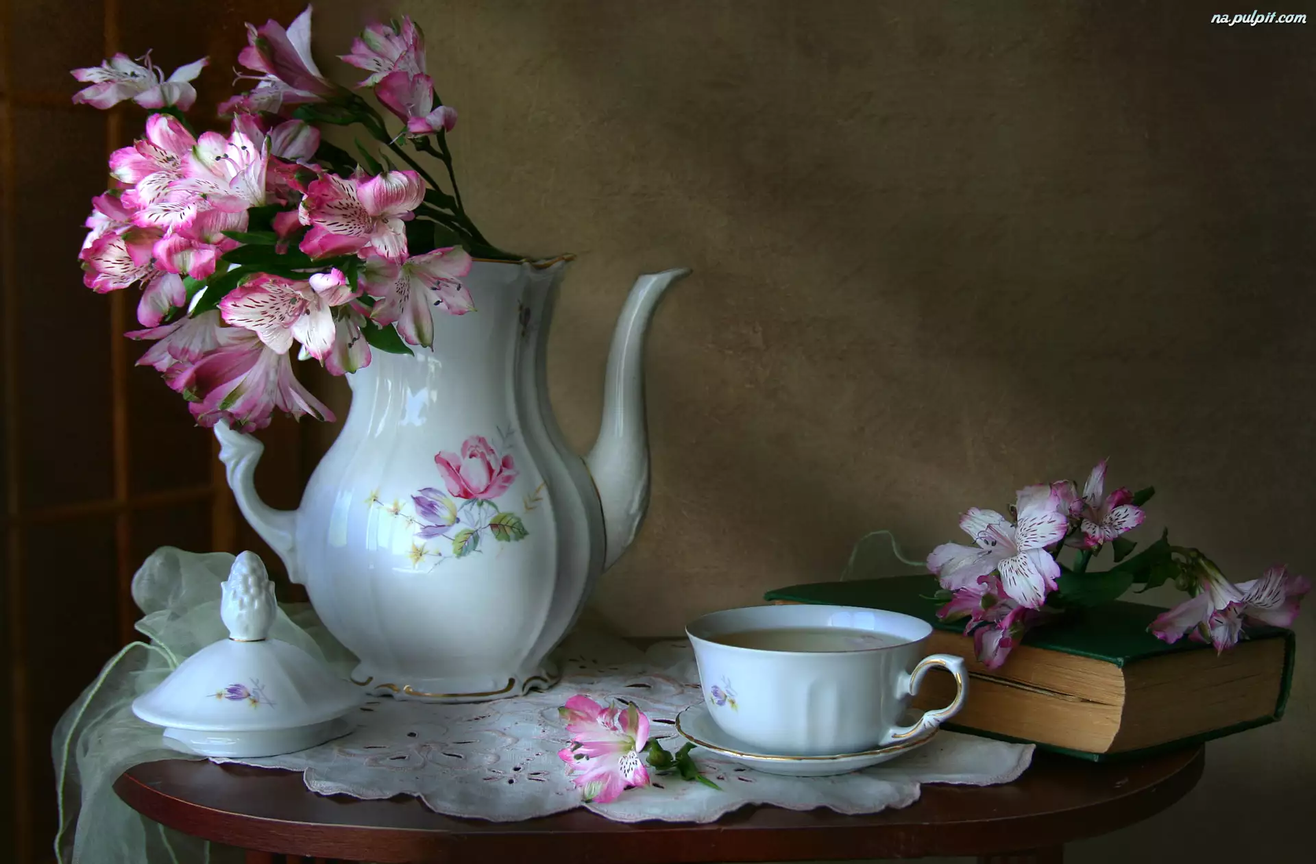 Alstremerie, Dzbanek, Kompozycja, Kwiaty, Książka, Herbata, Filiżanka