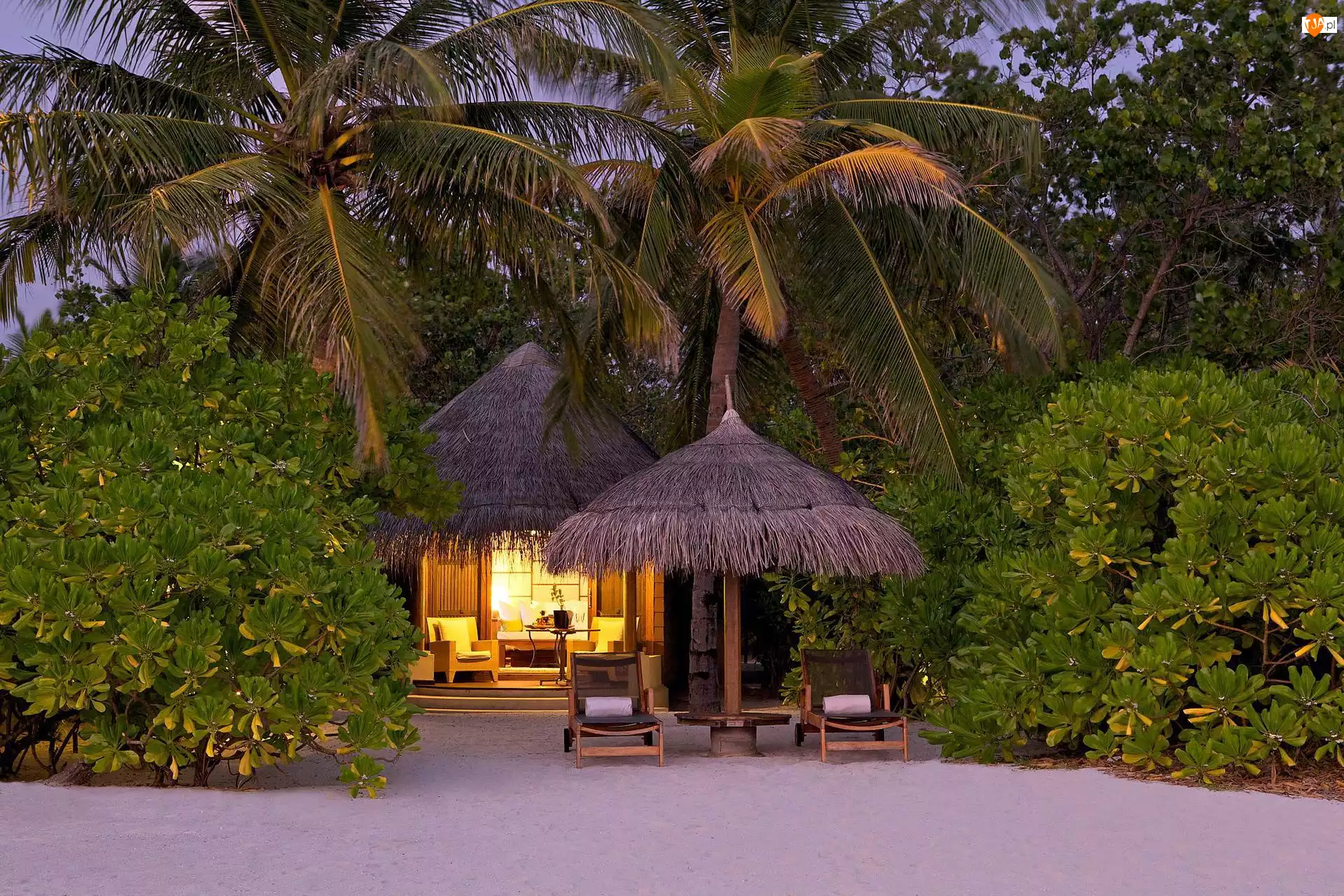 Krzewy, Palmy, Leżaki, Plaża, Altana, Parasol