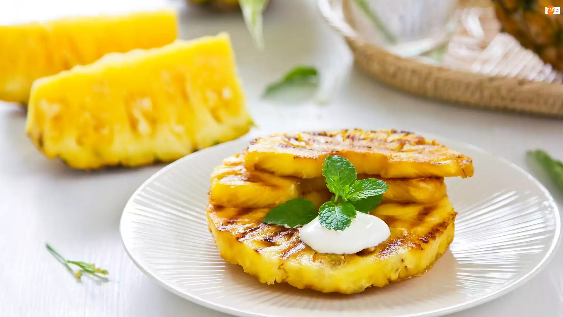 Śmietana, Talerz, Plastry, Ananas, Listki mięty