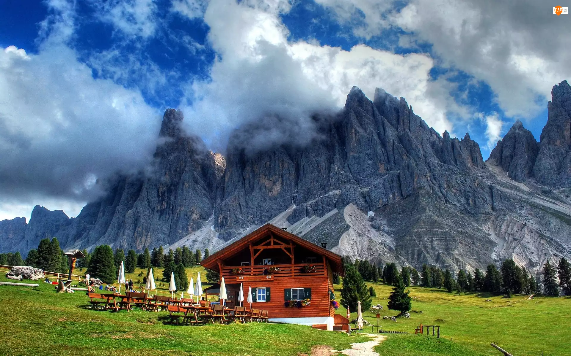 Austria, Góry, Restauracja, Chmury, Drzewa