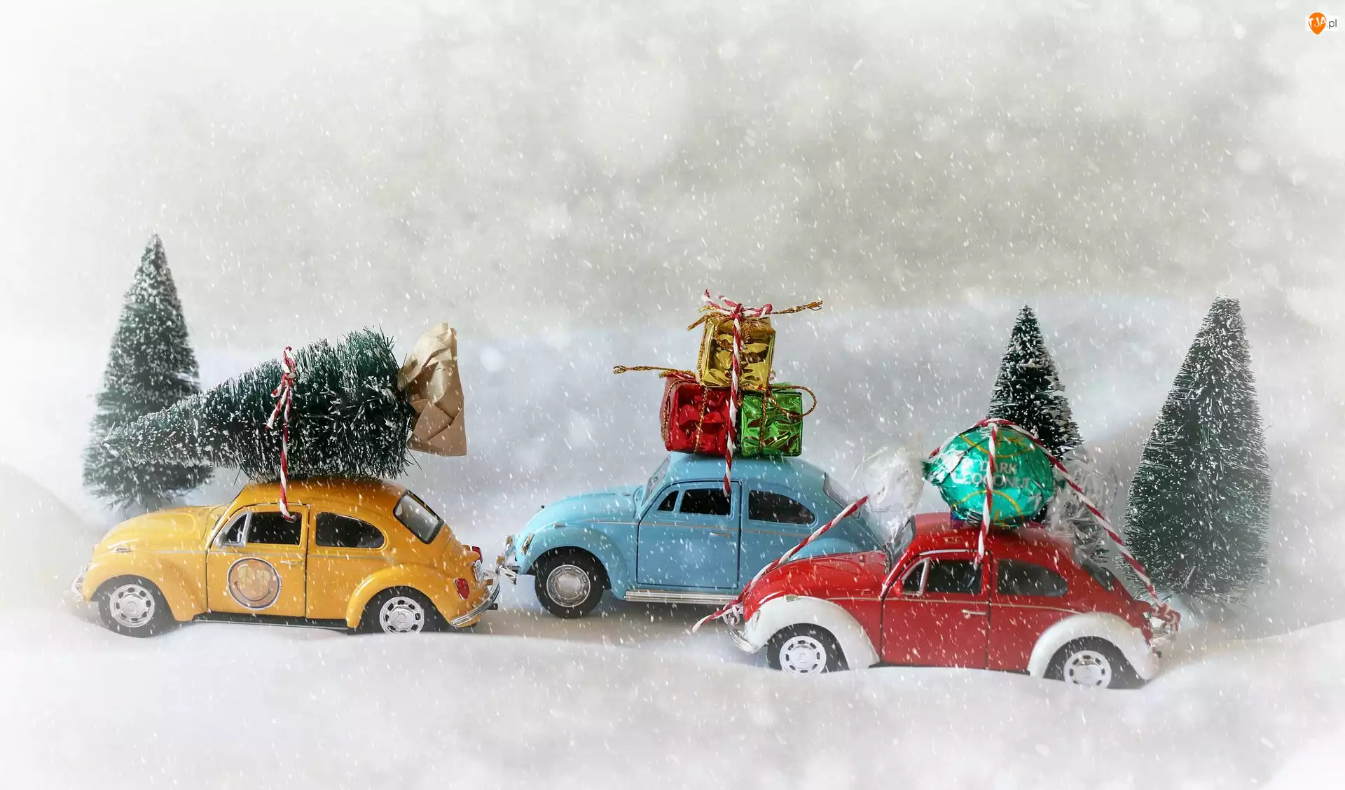 Choinki, Autka, Śnieg, Boże Narodzenie, Prezenty, Zima