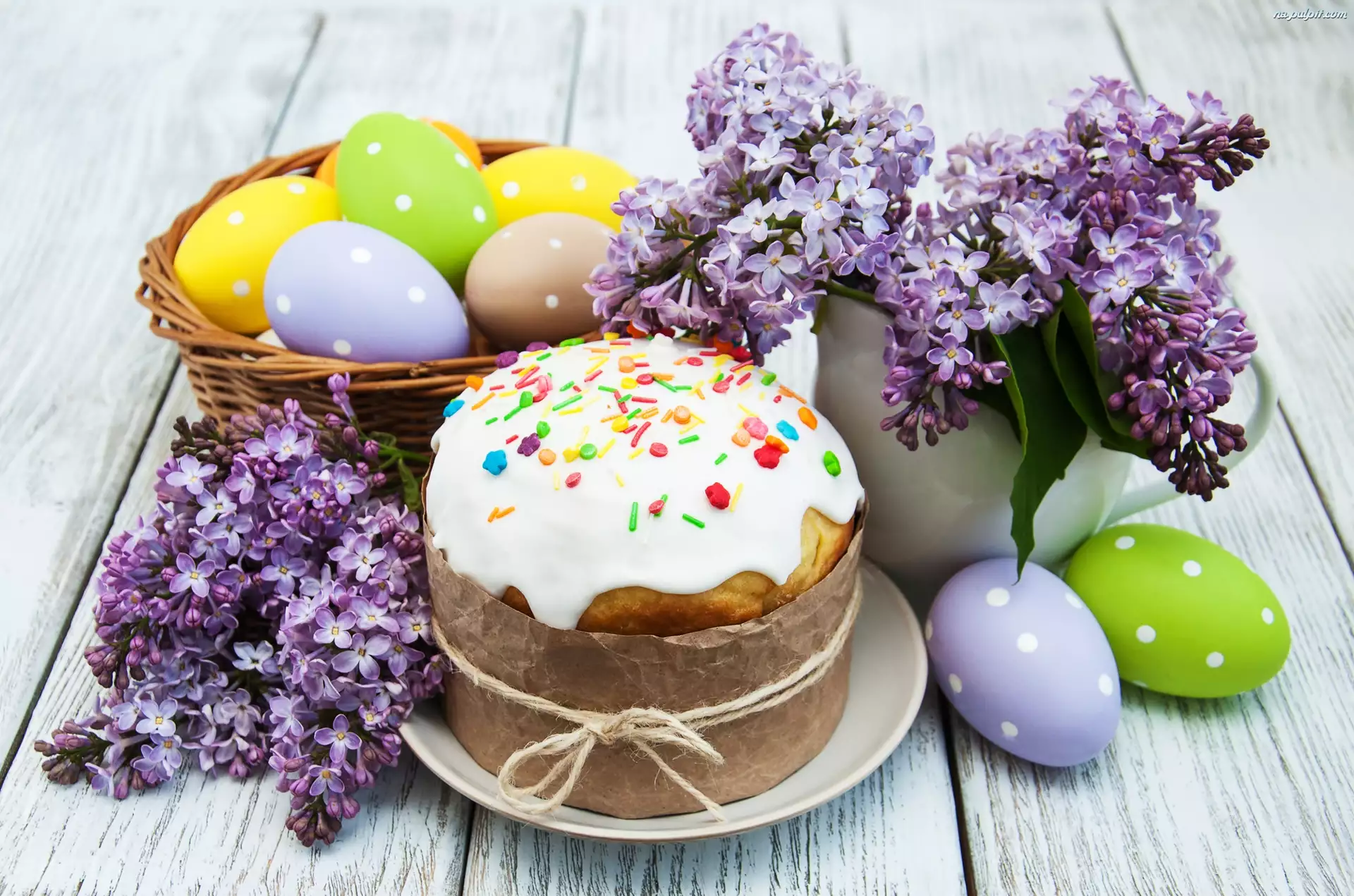 Wielkanoc, Kompozycja, Pisanki, Ciasto, Bez, Babka