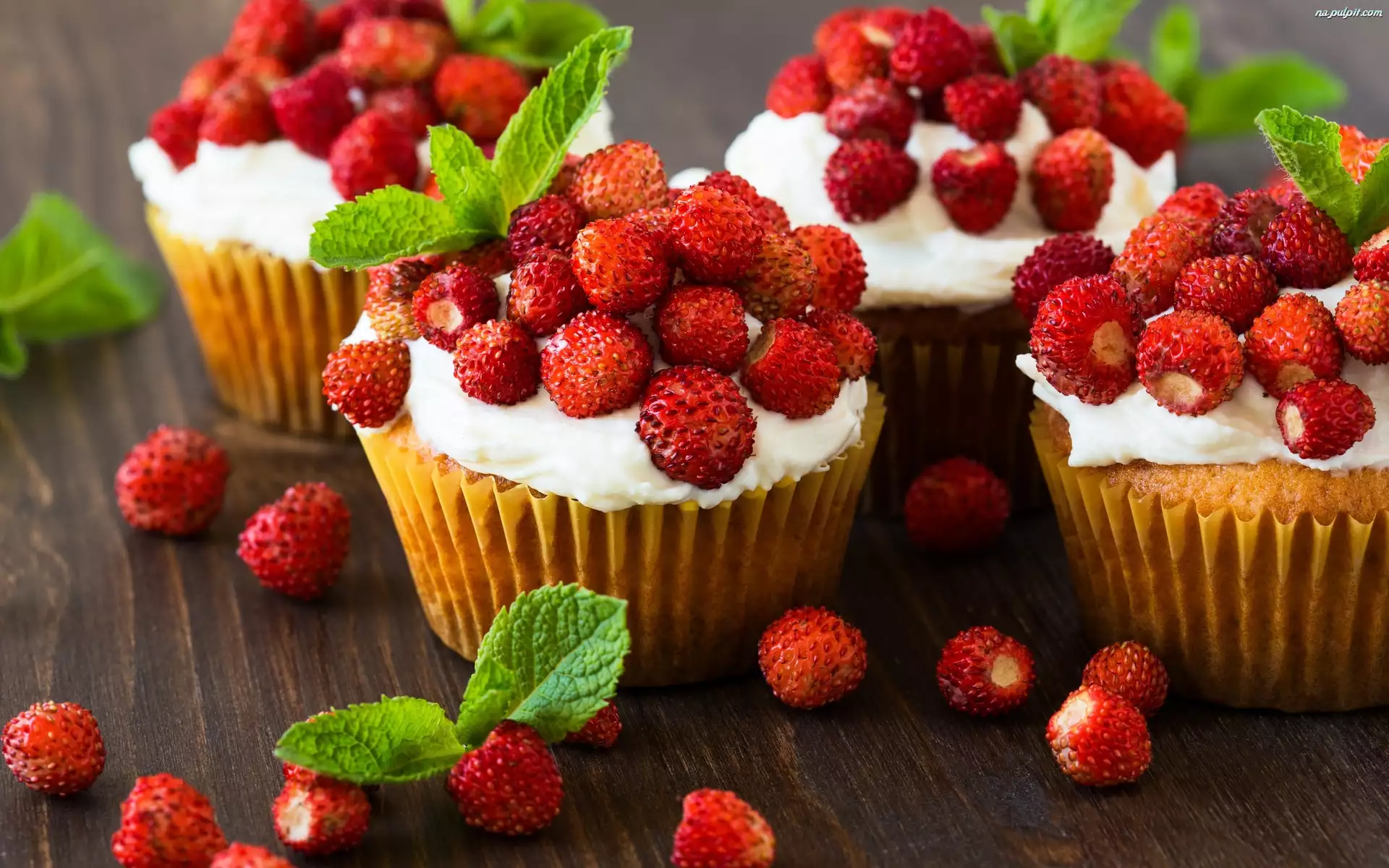 Babeczki, Listki Mięty, Śmietana, Poziomki