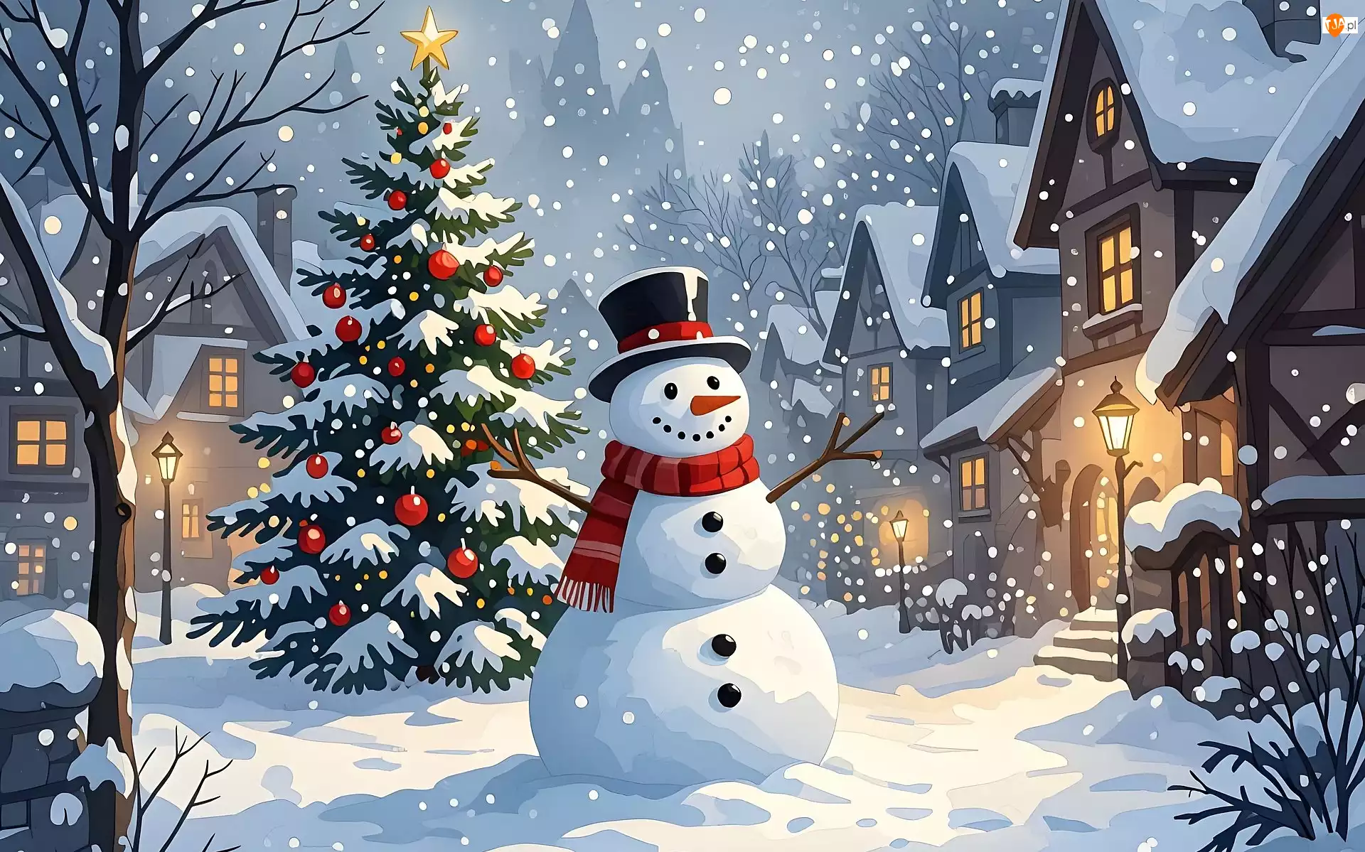 Bałwan, Boże Narodzenie, Szal, Bombki, Drzewo, Ośnieżona, Zima, Padający, Kapelusz, Choinka, Grafika, Domy, Śnieg