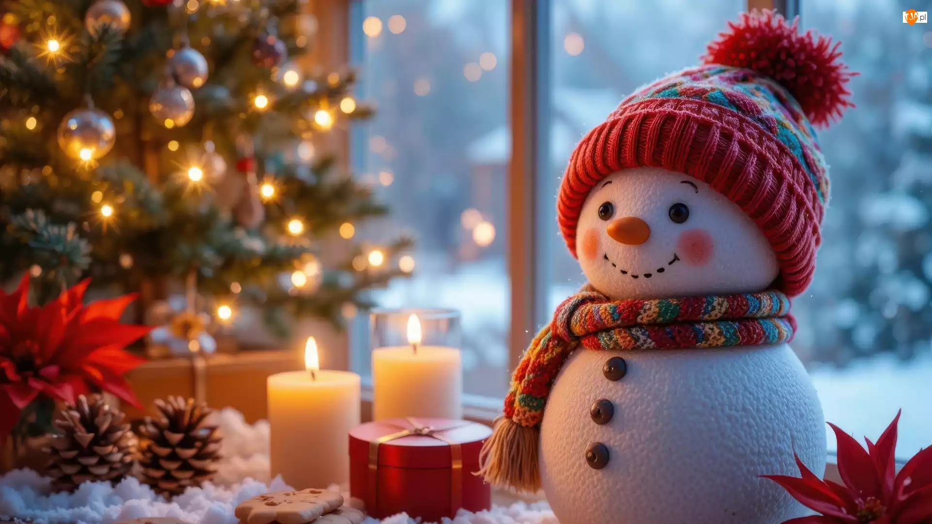 Okno, Świece, Bałwanek, Świąteczne, Choinka