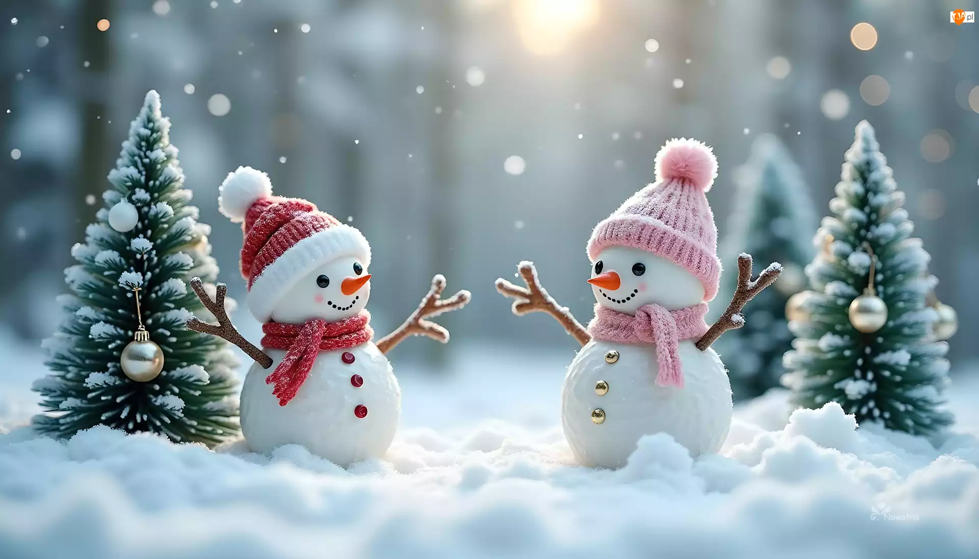 Bałwany, Dwa, Śnieg, Grafika, Choinki, Zima