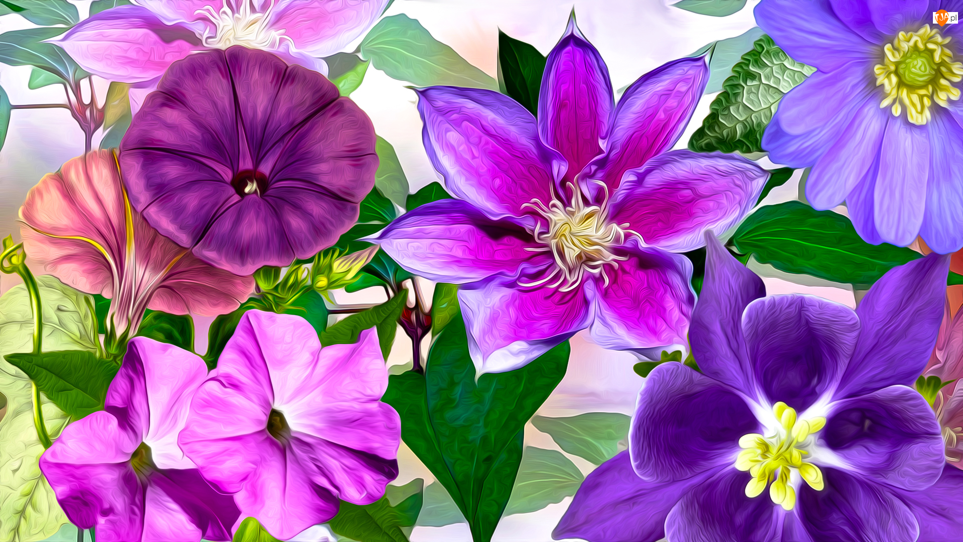 Kwiaty, Fioletowe, Powojnik, Grafika, Orlik, Powój