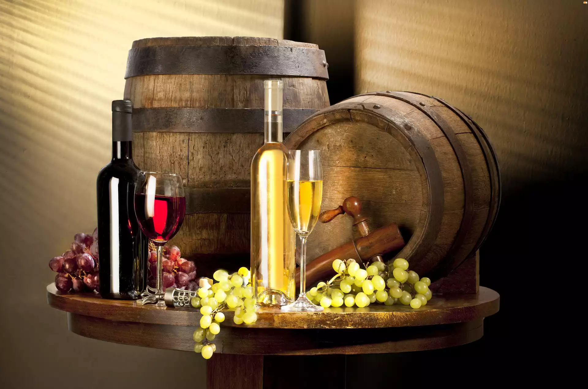 Baryłki, Winogrona, Butelki, Wino