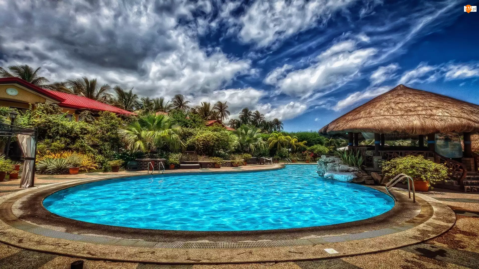 Basen, Chmury, Pawilon, Palmy