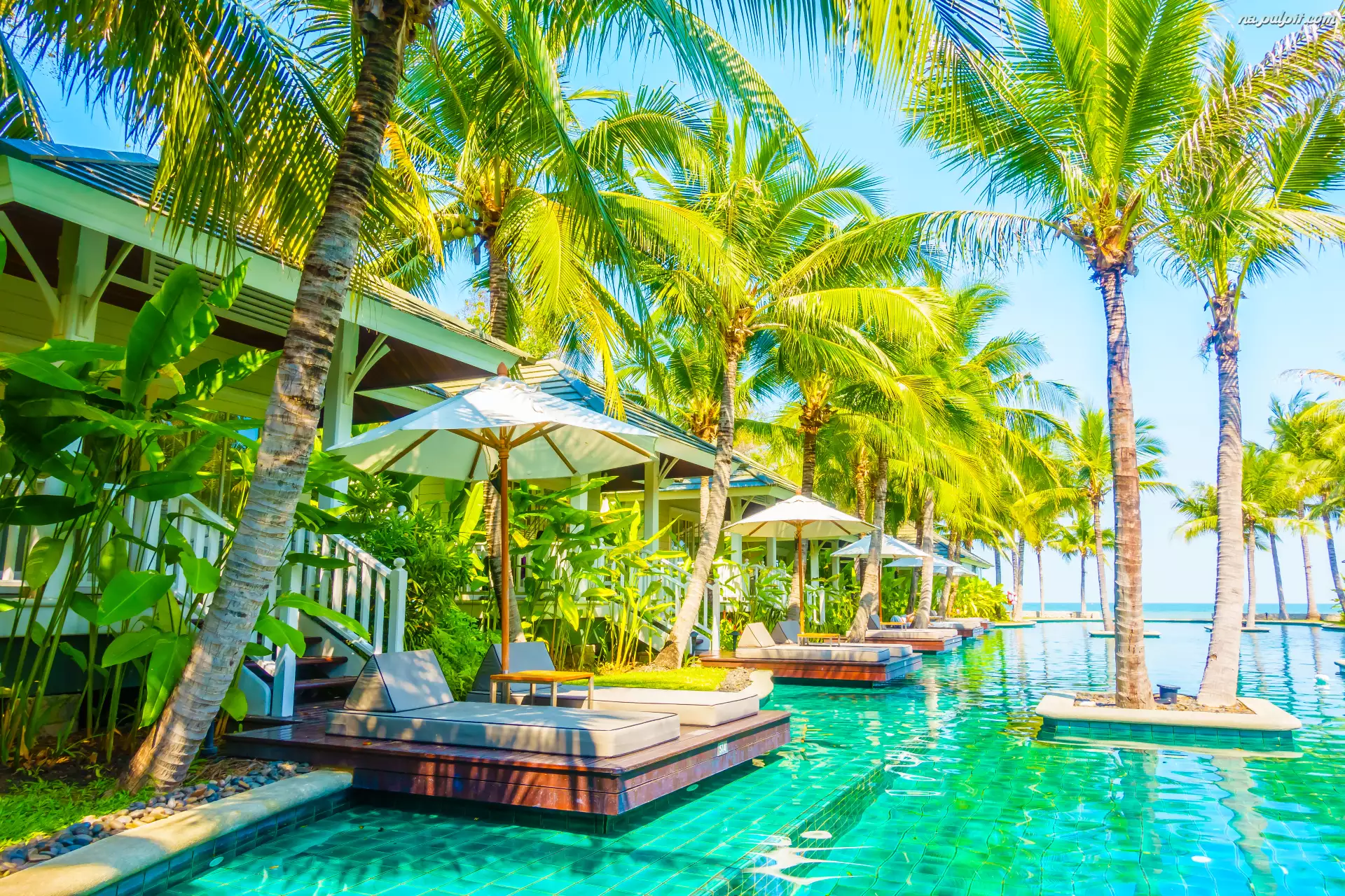 Basen, Dom, Parasole, Lato, Leżaki, Palmy, Schody