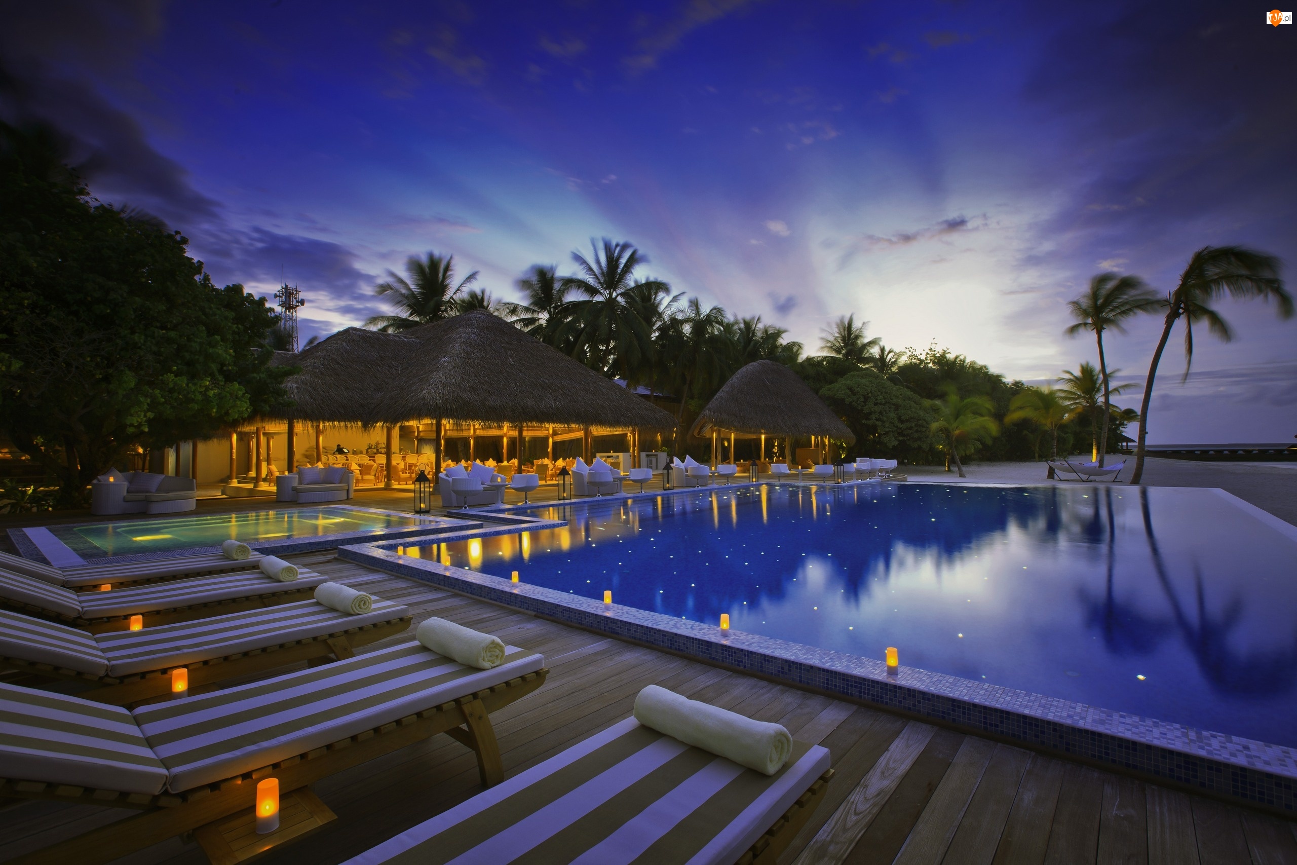 Basen, Palmy, Malediwy, Wakacje, Restauracja, Leżaki