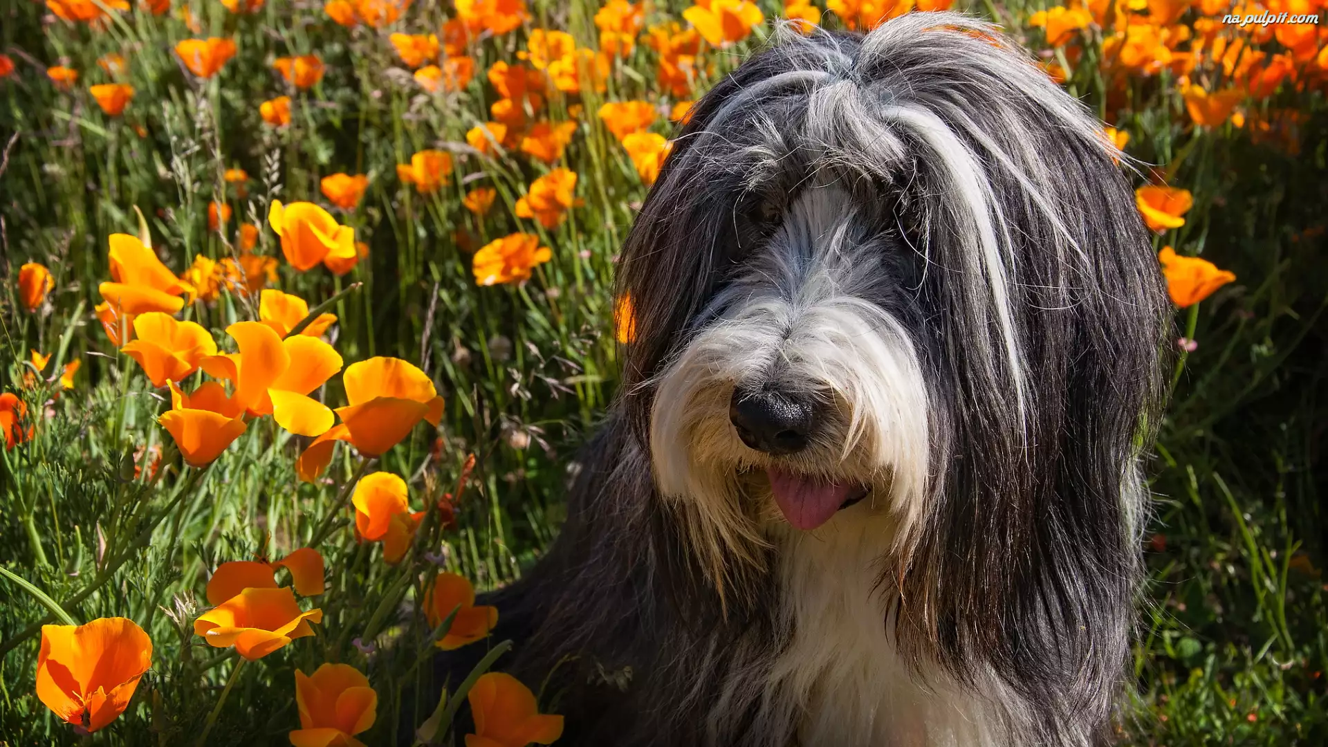 Bearded collie, Pies, Kwiaty, Maczki kalifornijskie, Pomarańczowe, Pozłotki