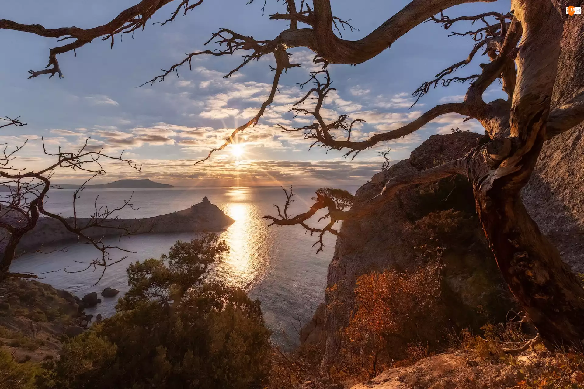Skały, Promienie słońca, Morze, Jesień, Drzewo