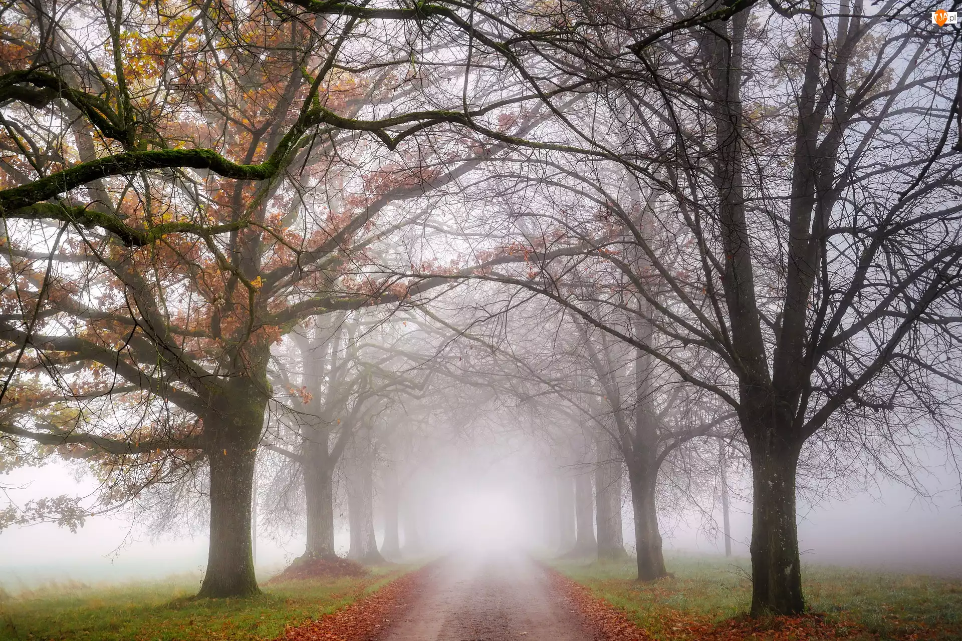 Szpalery, Mgła, Droga, Jesień, Drzewa