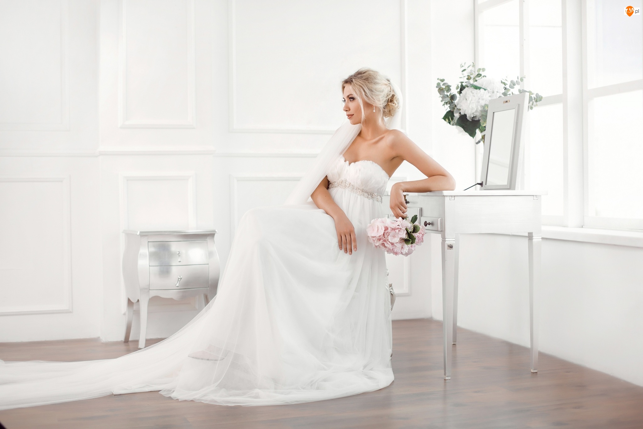 Panna młoda, Kobieta, Ślubna, Stolik, Suknia, Bukiet