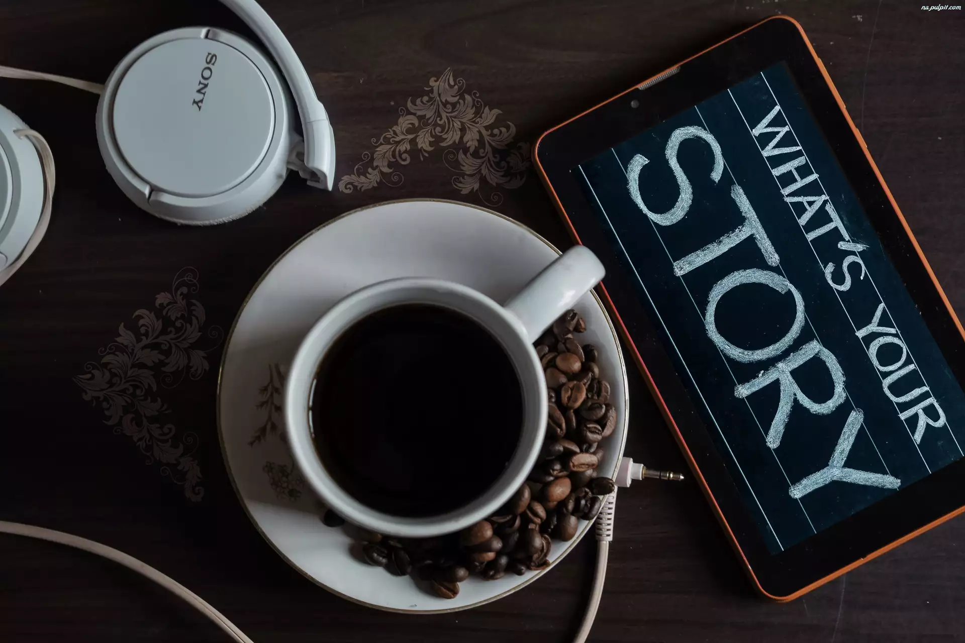 Biała, Słuchawki, Ziarna, Kawa, Filiżanka