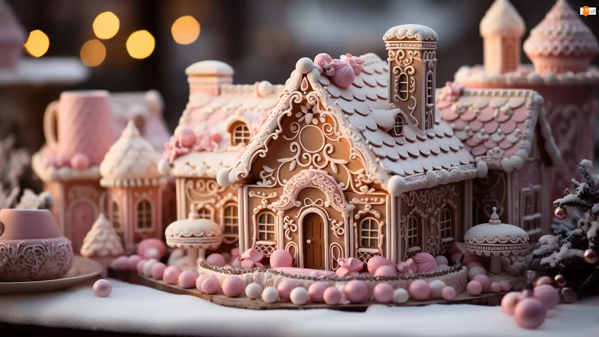 Białe, Boże Narodzenie, Domek, Kulki, Piernik, Różowe, Al, Udekorowany