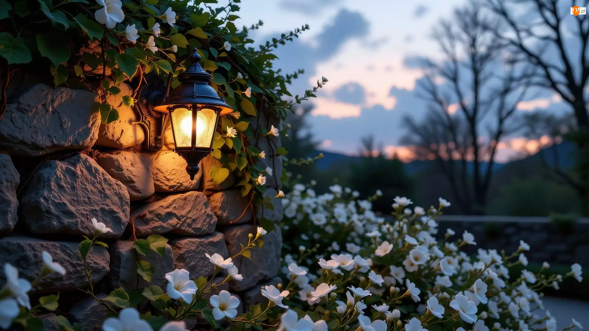 Białe, Drzewa, Latarnia, Mur, Kwiaty