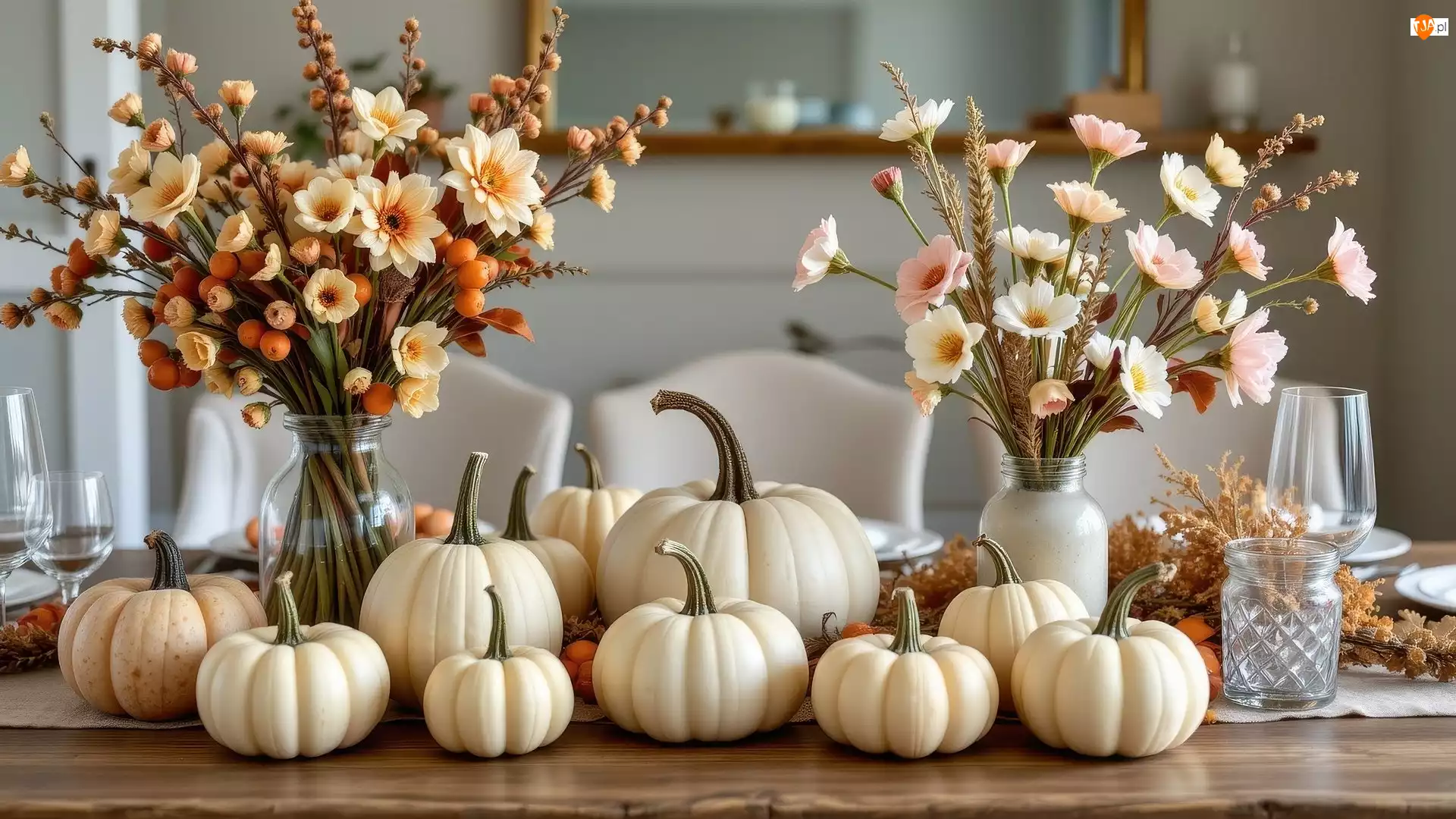 Białe, Dynie, Kieliszki, Kompozycja, Wazony, Kwia