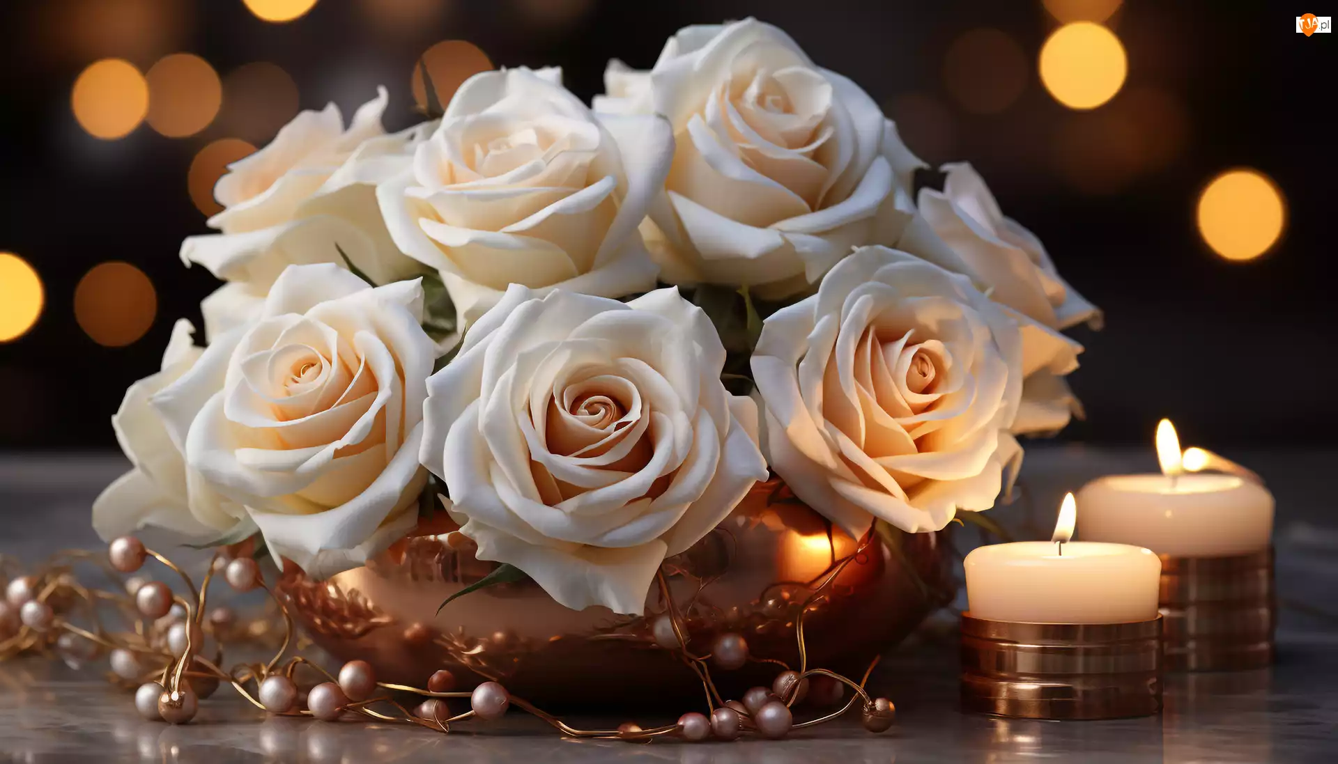 Białe, Kompozycja, Wazon, Świeczki, Róże, Koraliki