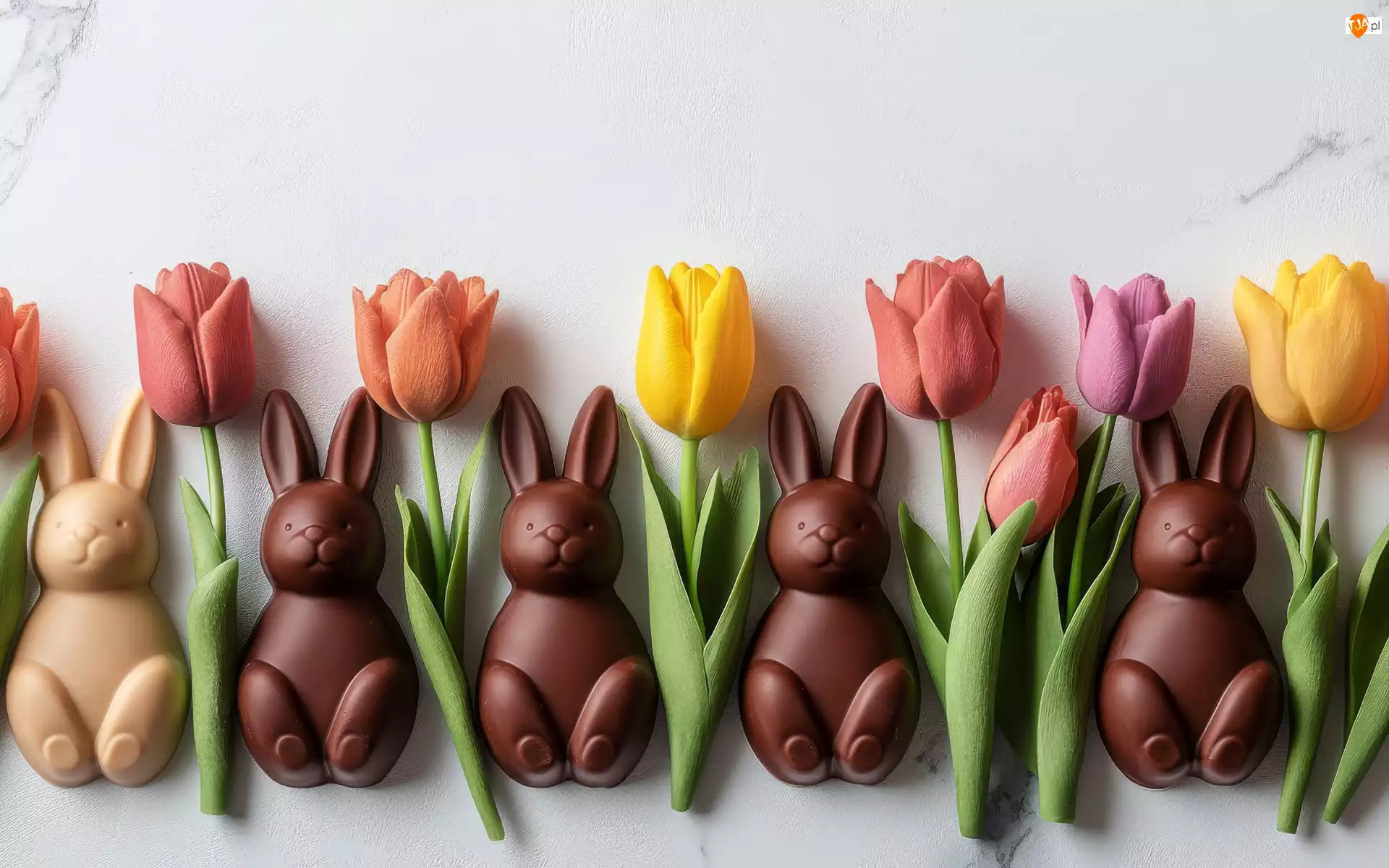 Białe, Kwiaty, Czekoladowe, Tło, Kolorowe, Króliki, Kompozycja, Tulipany