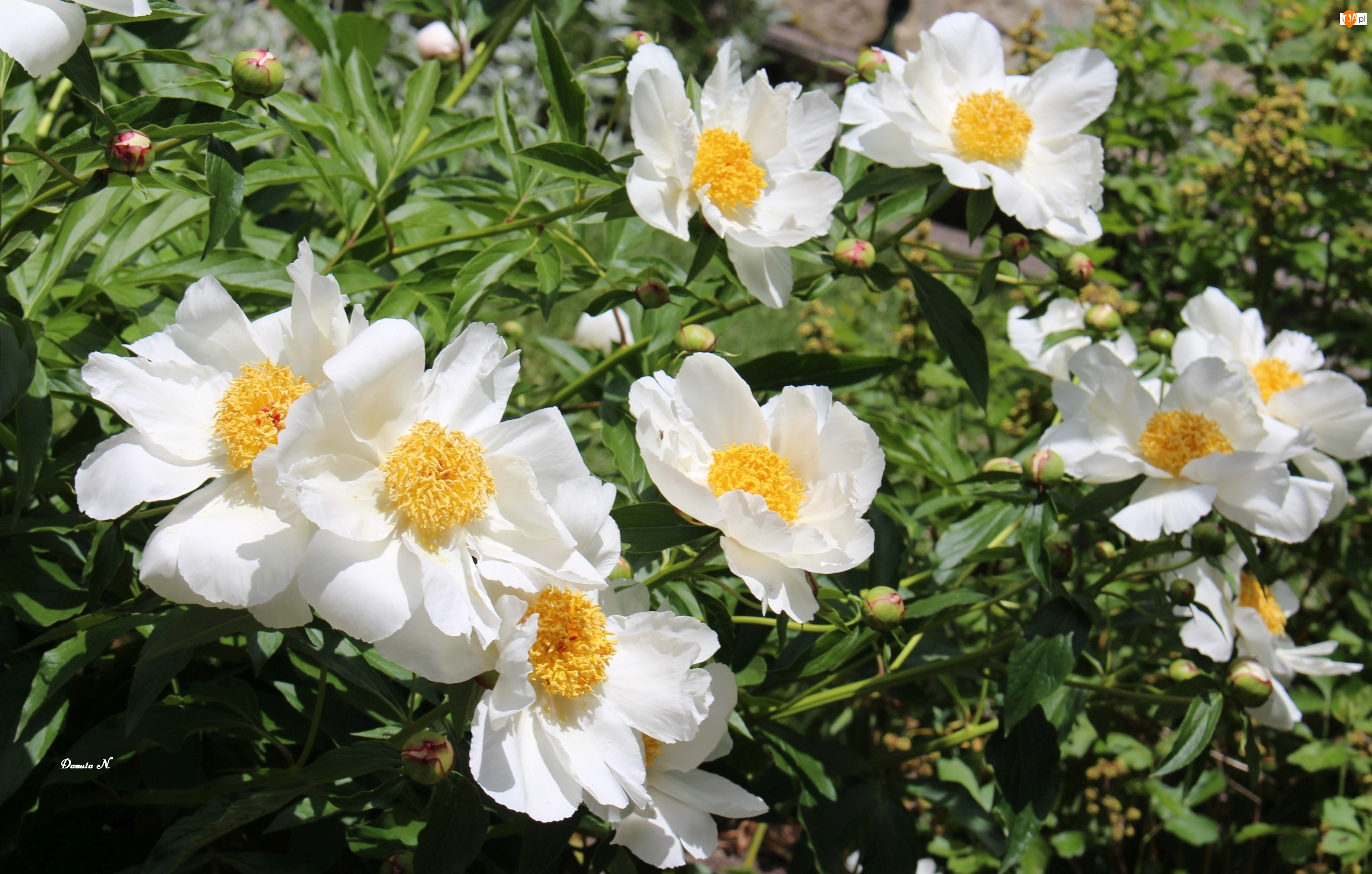 Białe, Liście, Kwiaty, Ogród, Piwonie, Pąki