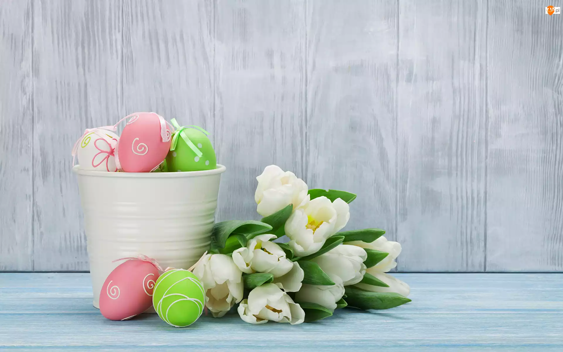 Białe tulipany obok pisanek w wiaderku i obok